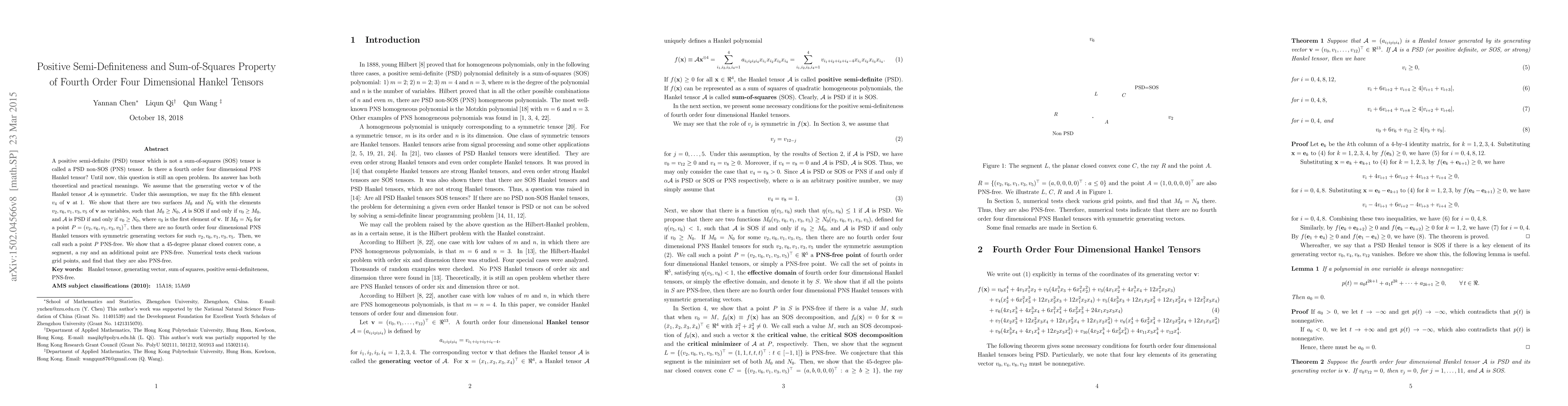A positive semi-definite (PSD) tensor which is not a sum-of-squares (SOS) tensor is called a PSD non-SOS (PNS) tensor. Is there a fourth order four dimensional PNS Hankel tensor? Until now, this question is still an open problem. Its answer has both theoretical and practical meanings. We assume that the generating vector $v$ of the Hankel tensor $A$ is symmetric. Under this assumption, we may fix the fifth element $v_4$ of $v$ at $1$. We show that there are two surfaces $M_0$ and $N_0$ with the elements $v_2, v_6, v_1, v_3, v_5$ of $v$ as variables, such that $M_0 \ge N_0$, $A$ is SOS if and only if $v_0 \ge M_0$, and $A$ is PSD if and only if $v_0 \ge N_0$, where $v_0$ is the first element of $v$. If $M_0 = N_0$ for a point $P = (v_2, v_6, v_1, v_3, v_5)^\top$, then there are no fourth order four dimensional PNS Hankel tensors with symmetric generating vectors for such $v_2, v_6, v_1, v_3, v_5$. Then, we call such a point $P$ PNS-free. We show that a $45$-degree planar closed convex cone, a segment, a ray and an additional point are PNS-free. Numerical tests check various grid points, and find that they are also PNS-free.