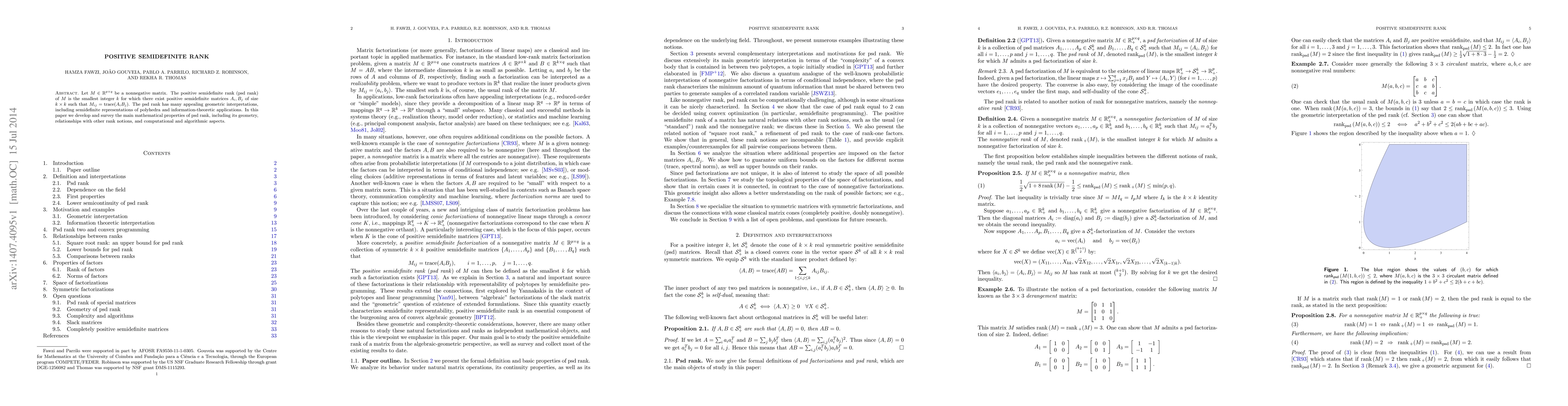 This paper explores the mathematical properties of positive semidefinite rank (psd rank), defining it as the smallest integer k for which a matrix M can be decomposed into traces of positive semidefinite matrices. It surveys its geometric interpretations, connections to other rank notions, and computational aspects.