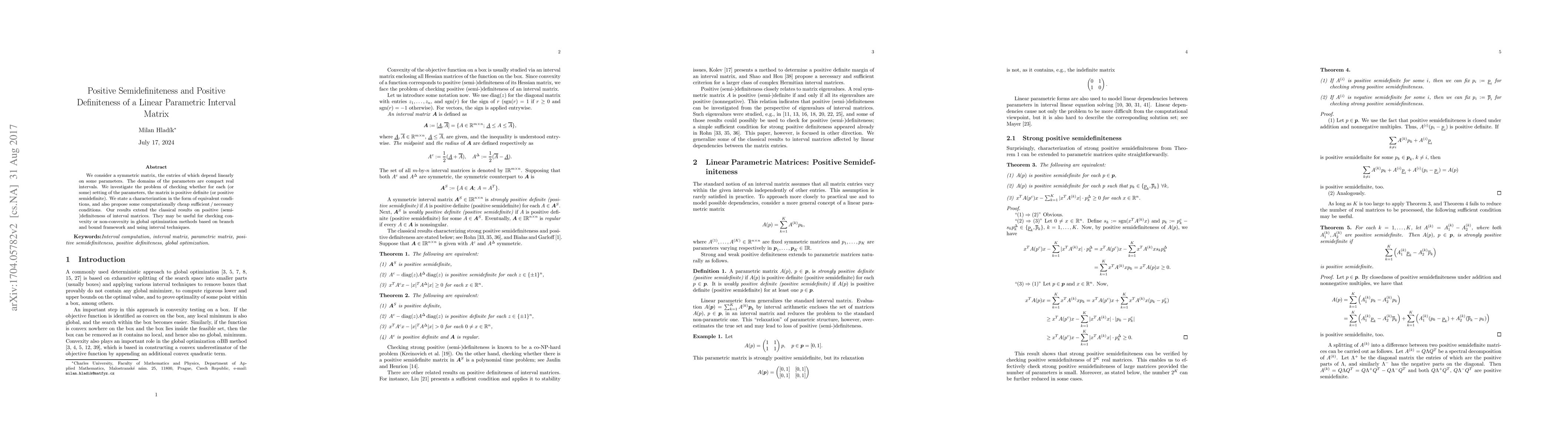 This paper investigates conditions for positive semidefiniteness and positive definiteness of a linear parametric interval matrix, providing equivalent characterizations and computationally efficient sufficient/necessary conditions. These results extend classical interval matrix theory, aiding in global optimization via branch and bound methods.