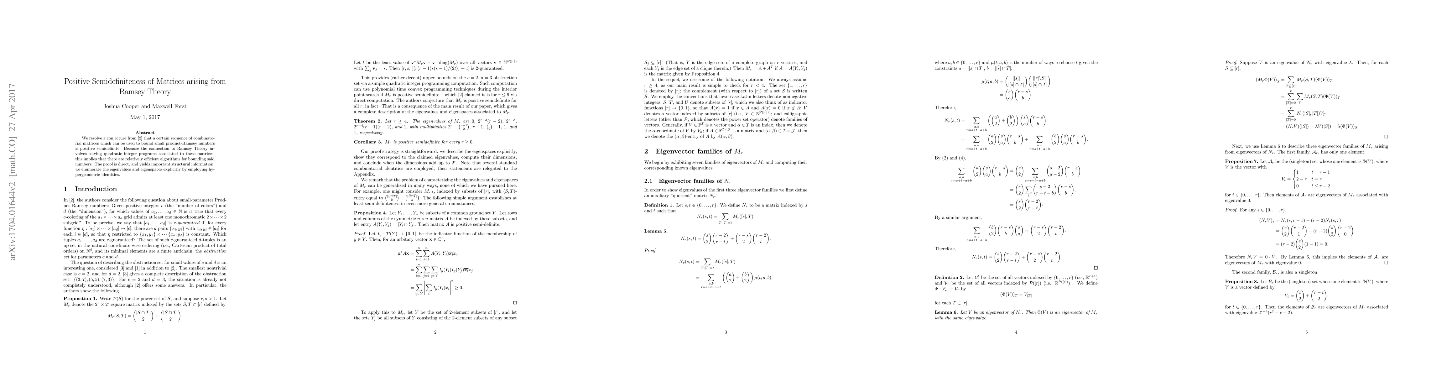 We resolve a conjecture of Cooper-Fenner-Purewal that a certain sequence of combinatorial matrices which can be used to bound small product-Ramsey numbers is positive semidefinite. Because the connection to Ramsey Theory involves solving quadratic integer programs associated to these matrices, this implies that there are relatively efficient algorithms for bounding said numbers. The proof is direct, and yields important structural information: we enumerate the eigenvalues and eigenspaces explicitly by employing hypergeometric identities.
