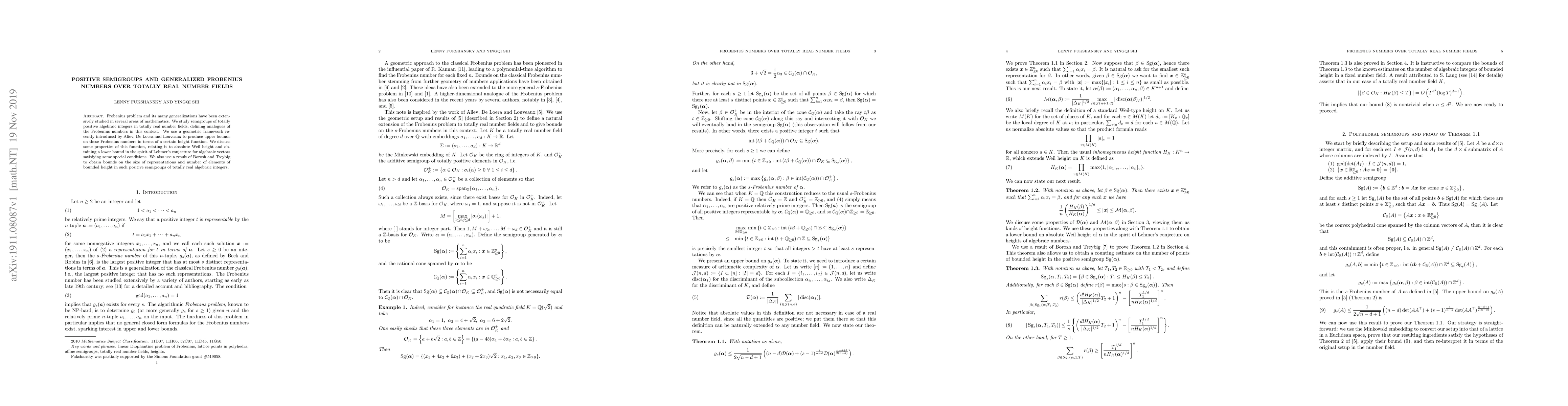 This paper investigates semigroups of totally positive algebraic integers in totally real number fields, defining generalized Frobenius numbers and using a geometric framework to derive upper bounds on these numbers through a height function. It also establishes lower bounds relating to Lehmer's conjecture and utilizes results from Borosh and Treybig to provide bounds on representations and element counts in these semigroups.