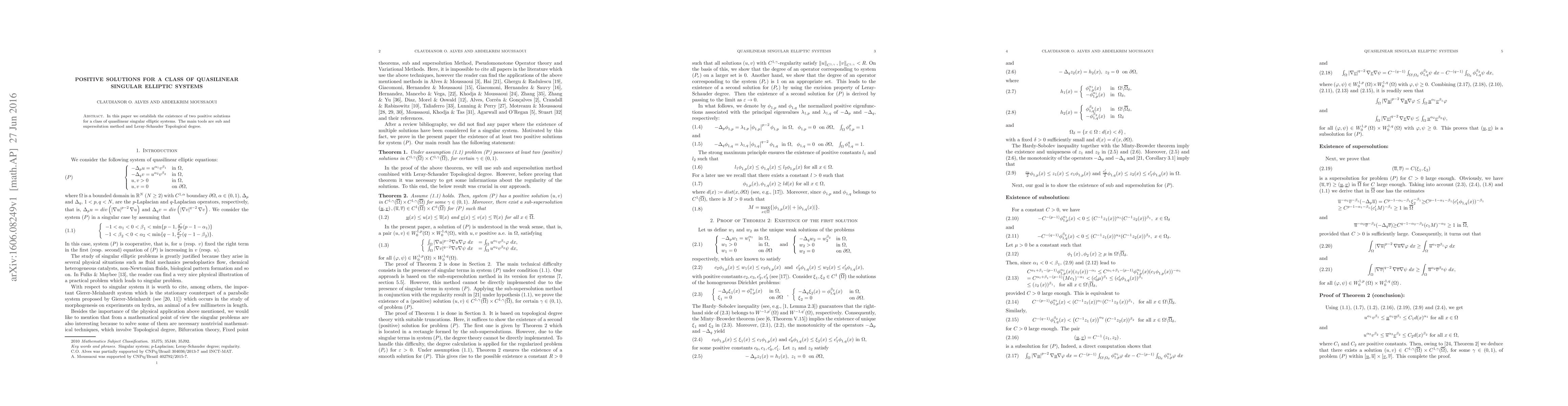 Summary: This paper demonstrates the existence of two positive solutions for a class of quasilinear singular elliptic systems using the sub and supersolution method and Leray-Schauder topological degree. The results are achieved through rigorous mathematical analysis.