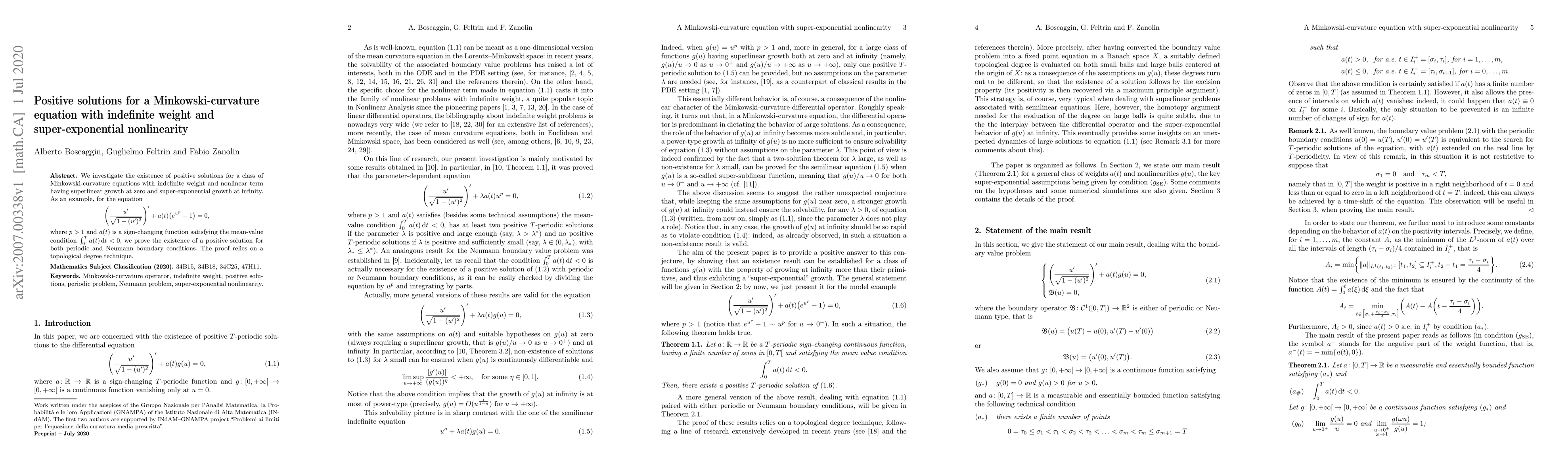 This paper explores the existence of positive solutions for Minkowski-curvature equations with indefinite weights and super-exponential nonlinearities. It proves the existence of such solutions for a specific equation with periodic and Neumann boundary conditions using a topological degree technique.