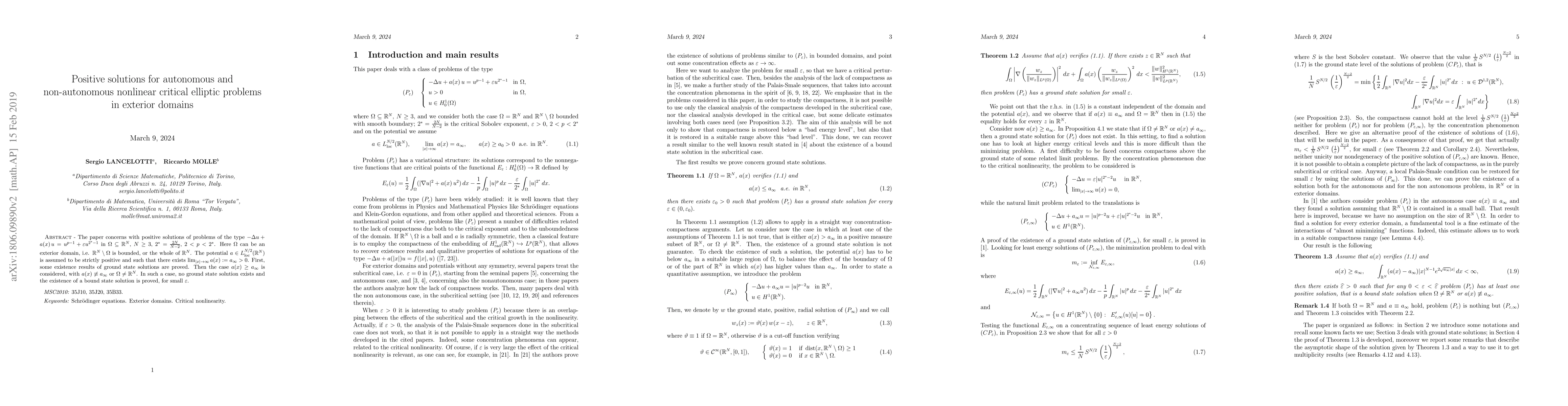 This paper investigates positive solutions for nonlinear critical elliptic problems of the form $-\Delta u + a(x)u = u^{p-1} + \varepsilon u^{2^*-1}$ in exterior domains, proving existence results for both ground and bound state solutions under varying conditions on the potential $a(x)$.