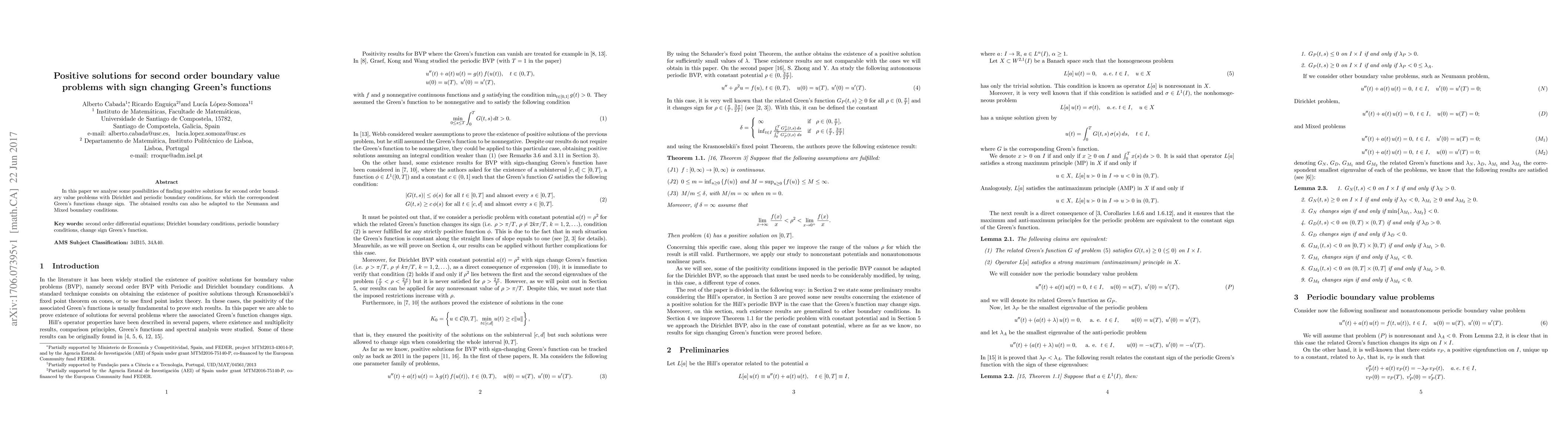 In this paper we analyse some possibilities of finding positive solutions for second order boundary value problems with Dirichlet and periodic boundary conditions, for which the correspondent Green's functions change sign. The obtained results can also be adapted to the Neumann and Mixed boundary conditions.