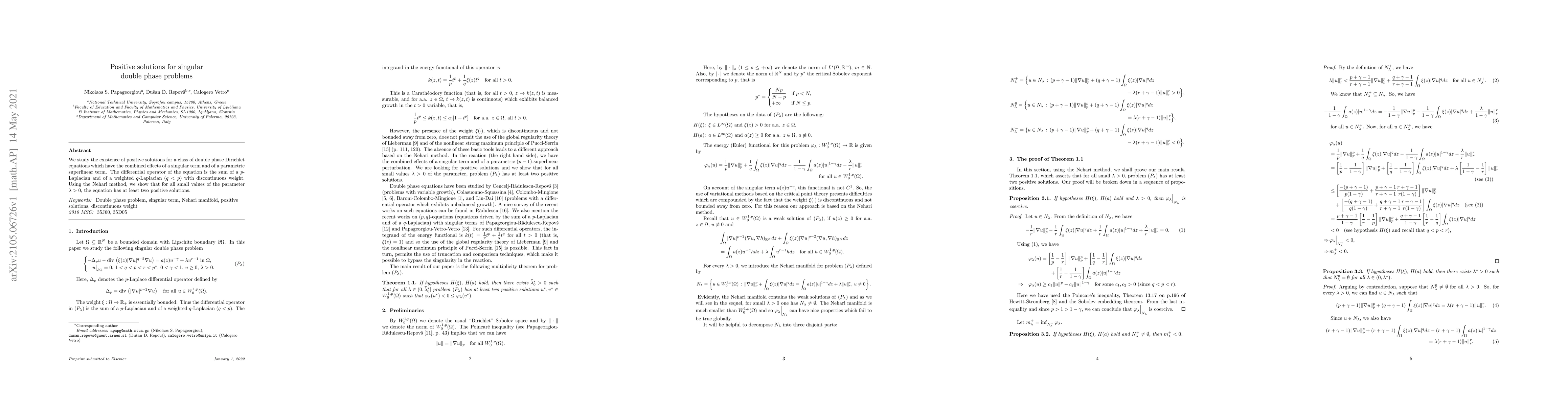 This paper investigates the existence of positive solutions for a singular double phase Dirichlet equation combining a $p$-Laplacian and a weighted $q$-Laplacian with a discontinuous weight. The authors demonstrate, using the Nehari method, that for sufficiently small values of the parameter $\lambda > 0$, the equation has at least two positive solutions.