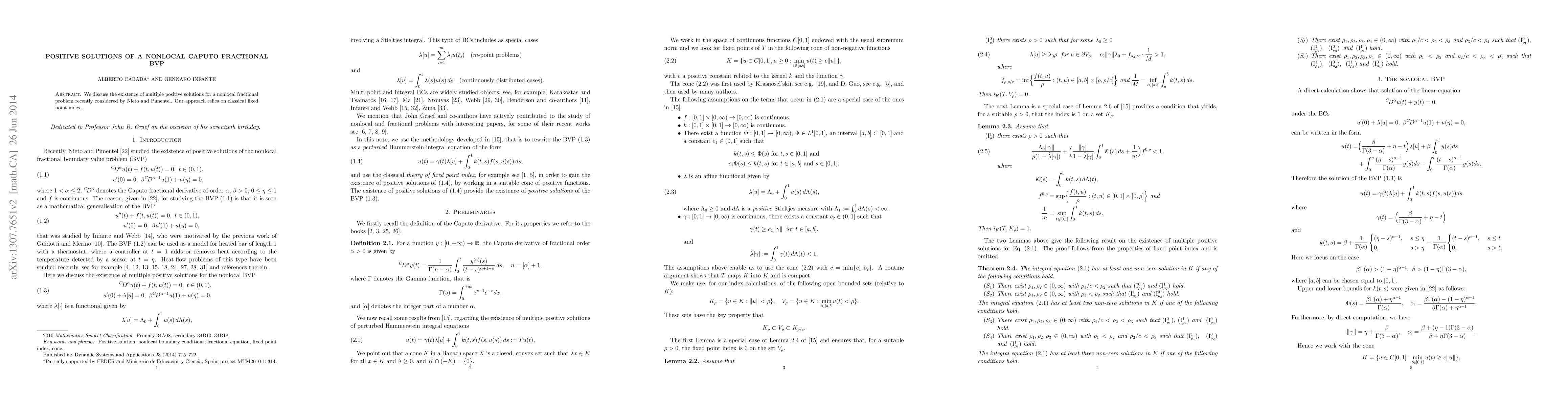 Summary: This paper explores the existence of multiple positive solutions for a nonlocal fractional boundary value problem (BVP) using Nieto and Pimental's model, employing the classical fixed point index theory for the analysis.