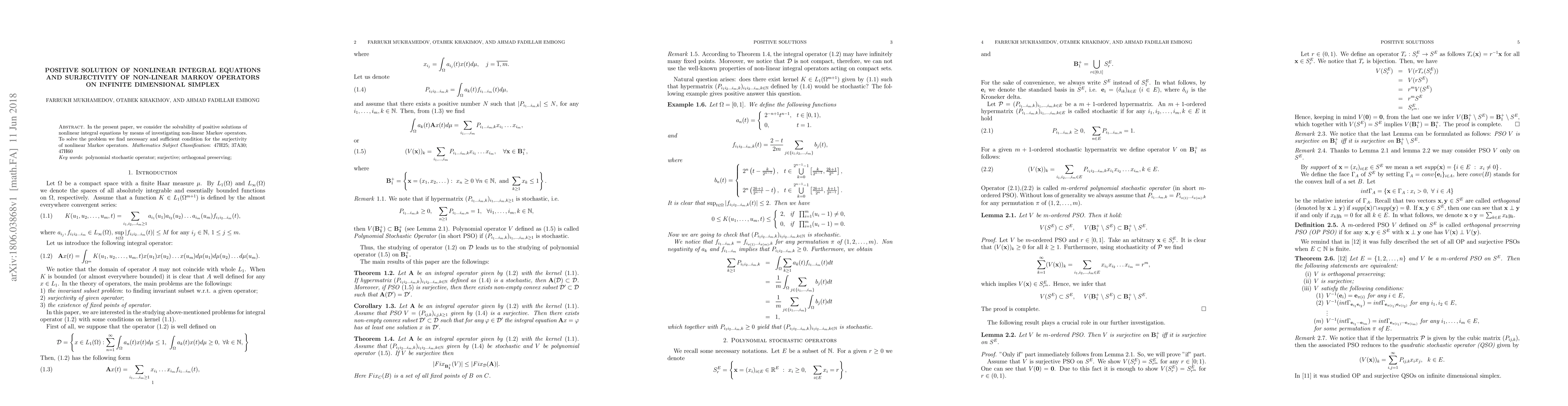In the present paper, we consider the solvability of positive solutions of nonlinear integral equations by means of investigating non-linear Markov operators. To solve the problem we find necessary and sufficient condition for the surjectivity of nonlinear Markov operators.
