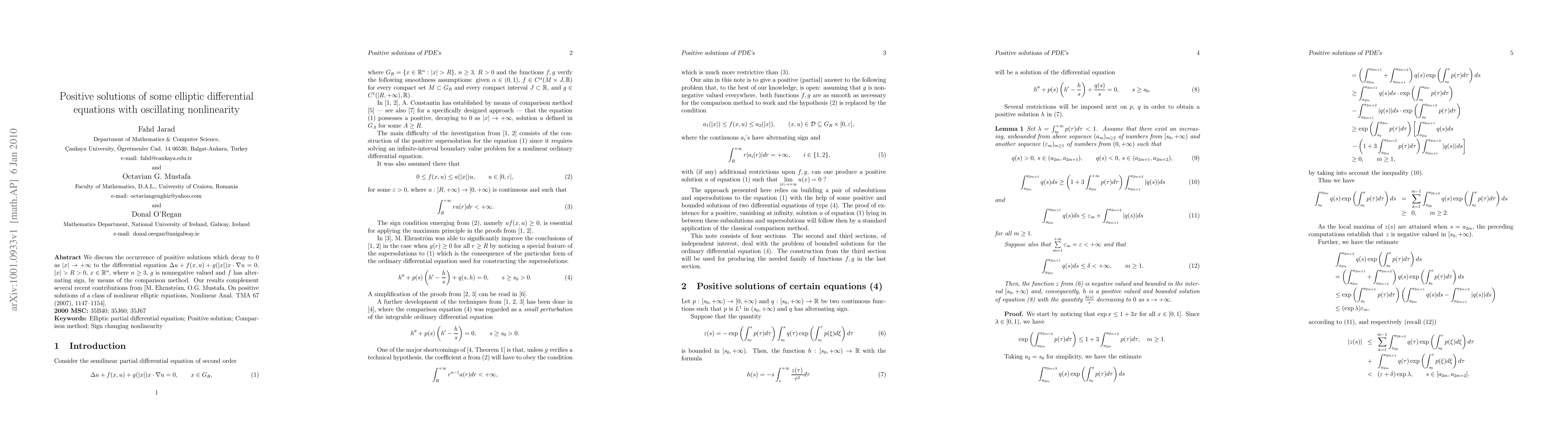We discuss the occurrence of positive solutions which decay to 0 as $| x|\to+\infty$ to the differential equation $\Delta u+f(x,u)+g(| x|)x\cdot\nabla u=0$, $| x|>R>0$, $x\in\mathbb{R}^{n}$, where $n\geq 3$, $g$ is nonnegative valued and $f$ has alternating sign, by means of the comparison method. Our results complement several recent contributions from [M. Ehrnstr\"{o}m, O.G. Mustafa, On positive solutions of a class of nonlinear elliptic equations, Nonlinear Anal. TMA 67 (2007), 1147--1154].
