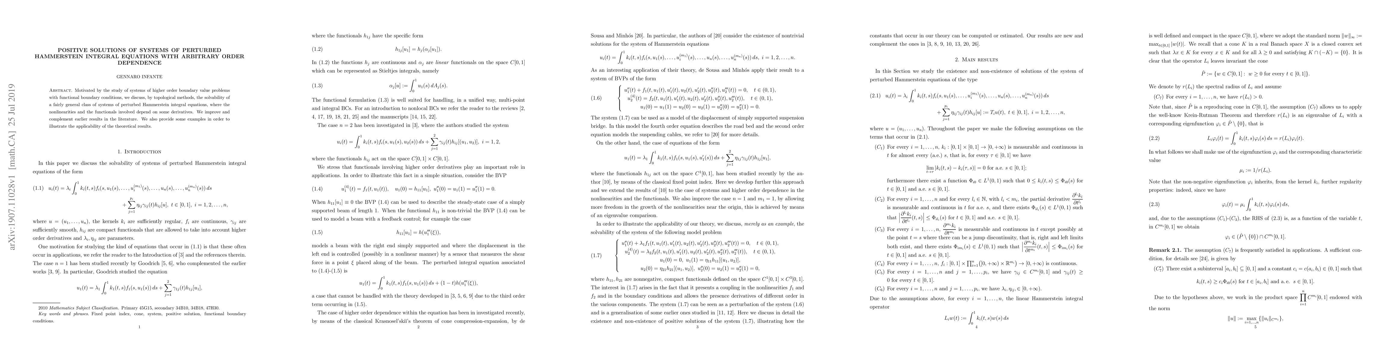 This paper explores the solvability of perturbed Hammerstein integral equations with arbitrary order dependence using topological methods, improving upon previous results and providing illustrative examples. The focus is on systems motivated by higher order boundary value problems with functional boundary conditions.