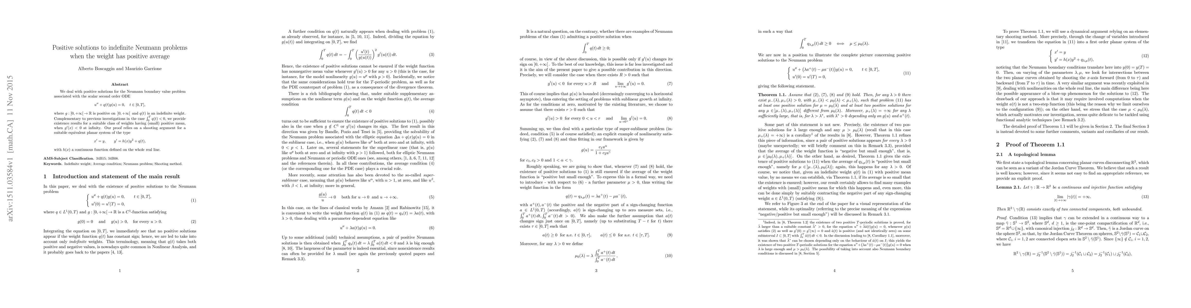 This paper investigates the existence of positive solutions for Neumann boundary value problems associated with a scalar second-order ODE under an indefinite weight with a small positive average. The authors provide existence results using a shooting argument for a planar system equivalent to the original ODE.