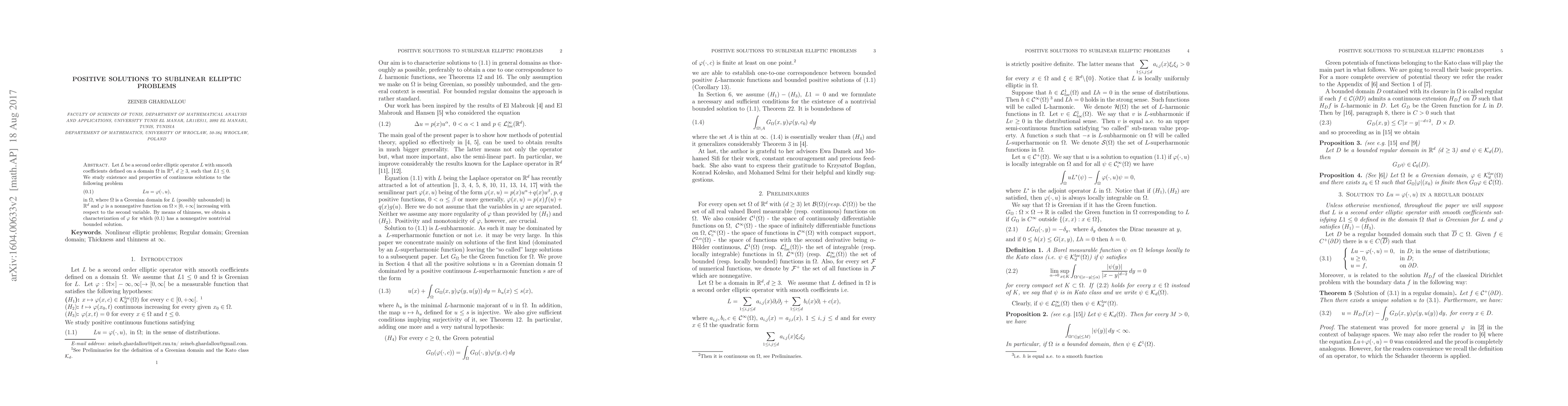 Let $L$ be a second order elliptic operator $L$ with smooth coefficients defined on a domain $\Omega $ in $\mathbb{R}^d $, $d\geq3$, such that $L1\leq 0$. We study existence and properties of continuous solutions to the following problem \begin{equation}\label{00} Lu=\varphi(\cdot,u),% & \hbox{in $\Omega $; in the sens of distribution;} \\ \end{equation} in $\Omega,$ where $\Omega$ is a Greenian domain for $L$ {(possibly unbounded)} in $\mathbb{R}^d$ and $\varphi $ is a nonnegative function on $\Omega\times [0,+\infty [$ increasing with respect to the second variable. By means of thinness, we obtain a characterization of $\varphi$ for which \eqref{00} has a nonnegative nontrivial bounded solution.
