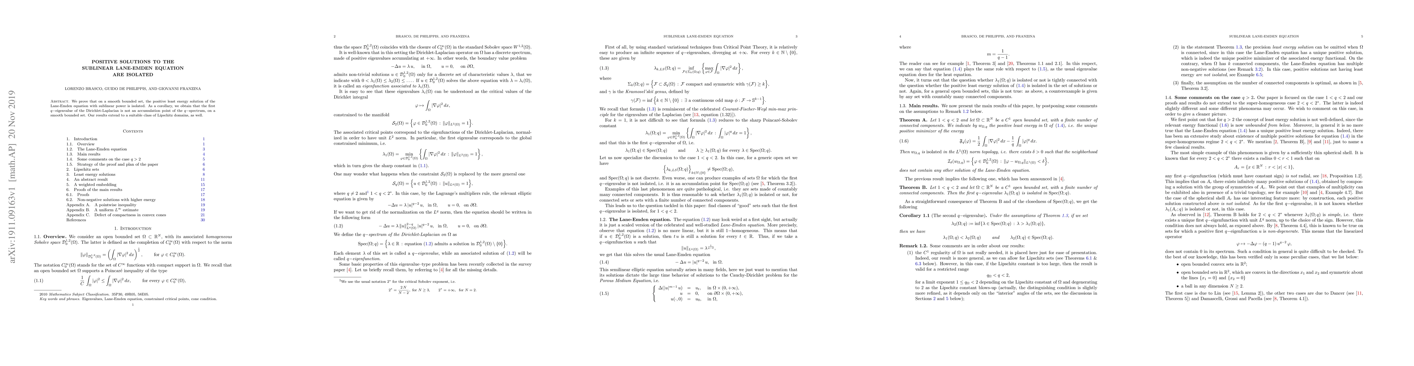 This paper proves that the positive least energy solution to the sublinear Lane-Emden equation on a smooth bounded set is isolated. Consequently, it shows that the first $q$-eigenvalue of the Dirichlet-Laplacian is not an accumulation point of the $q$-spectrum on such sets, extending to a class of Lipschitz domains.