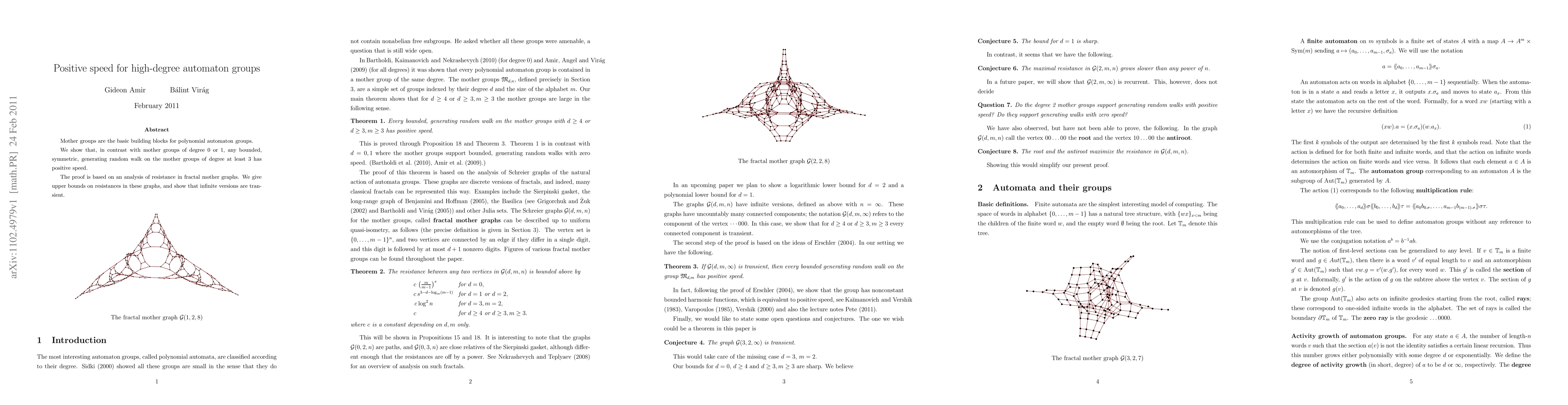 Mother groups are the basic building blocks for polynomial automaton groups. We show that, in contrast with mother groups of degree 0 or 1, any bounded, symmetric, generating random walk on the mother groups of degree at least 3 has positive speed. The proof is based on an analysis of resistance in fractal mother graphs. We give upper bounds on resistances in these graphs, and show that infinite versions are tran- sient.