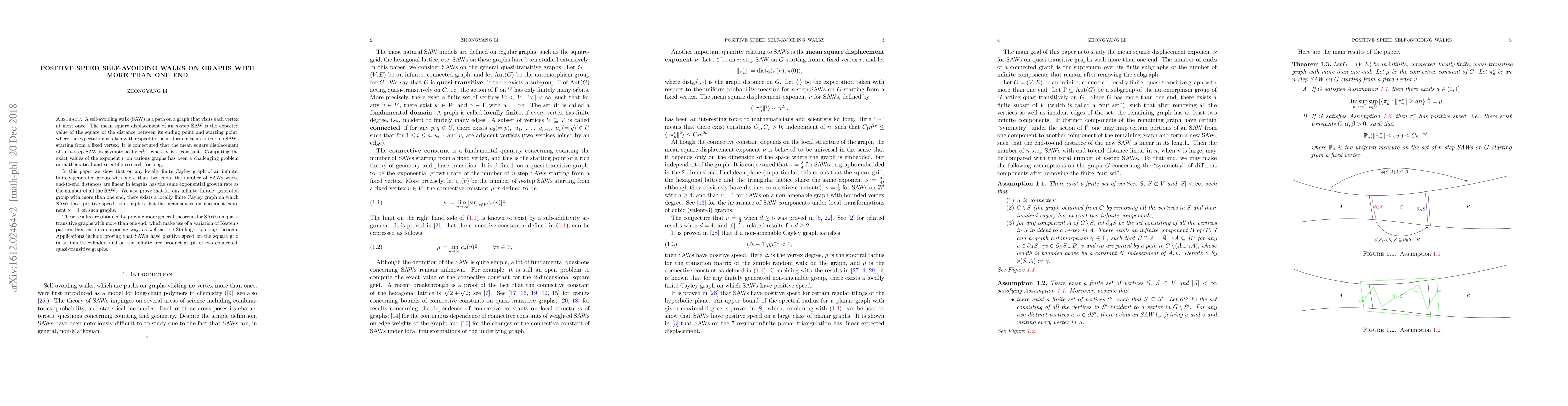 A self-avoiding walk (SAW) is a path on a graph that visits each vertex at most once. The mean square displacement of an $n$-step SAW is the expected value of the square of the distance between the ending point and the starting point of an $n$-step SAW, where the expectation is taken with respect to the uniform measure on $n$-step SAWs starting from a fixed vertex. It is conjectured that the mean square displacement of an $n$-step SAW is asymptotically $n^{2\nu}$, where $\nu$ is a constant. Computing the exact values of the exponent $\nu$ on various graphs has been a challenging problem in mathematical and scientific research for long. In this paper we show that on any locally finite Cayley graph of an infinite, finitely-generated group with more than two ends, the number of SAWs whose end-to-end distances are linear in lengths has the same exponential growth rate as the number of all the SAWs. We also prove that for any infinite, finitely-generated group with more than one end, there exists a locally finite Cayley graph on which SAWs have positive speed - this implies that the mean square displacement exponent $\nu=1$ on such graphs. These results are obtained by proving more general theorems for SAWs on quasi-transitive graphs with more than one end, which make use of a variation of Kesten's pattern theorem in a surprising way, as well as the Stalling's splitting theorem. Applications include proving that SAWs have positive speed on the square grid in an infinite cylinder, and on the infinite free product graph of two connected, quasi-transitive graphs.