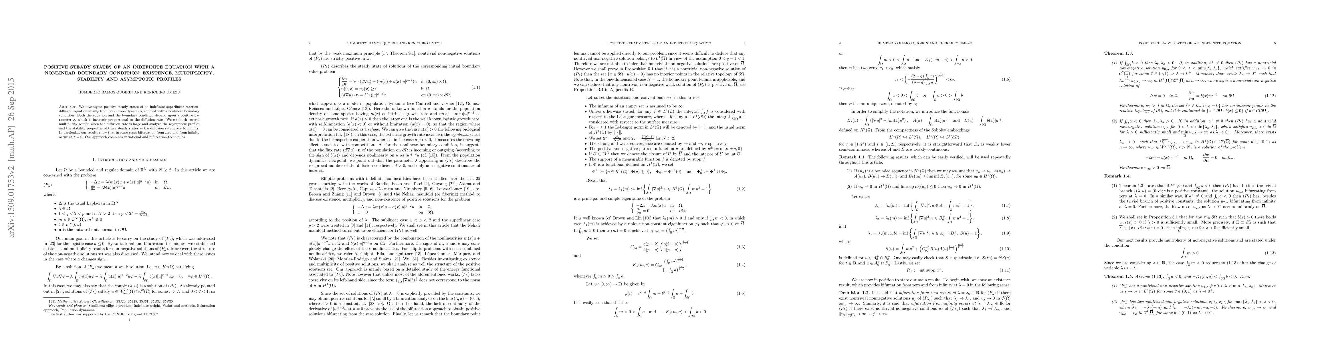 We investigate positive steady states of an indefinite superlinear reaction-diffusion equation arising from population dynamics, coupled with a nonlinear boundary condition. Both the equation and the boundary condition depend upon a positive parameter $\lambda$, which is inversely proportional to the diffusion rate. We establish several multiplicity results when the diffusion rate is large and analyze the asymptotic profiles and the stability properties of these steady states as the diffusion rate grows to infinity. In particular, our results show that in some cases bifurcation from zero and from infinity occur at $\lambda=0$. Our approach combines variational and bifurcation techniques.