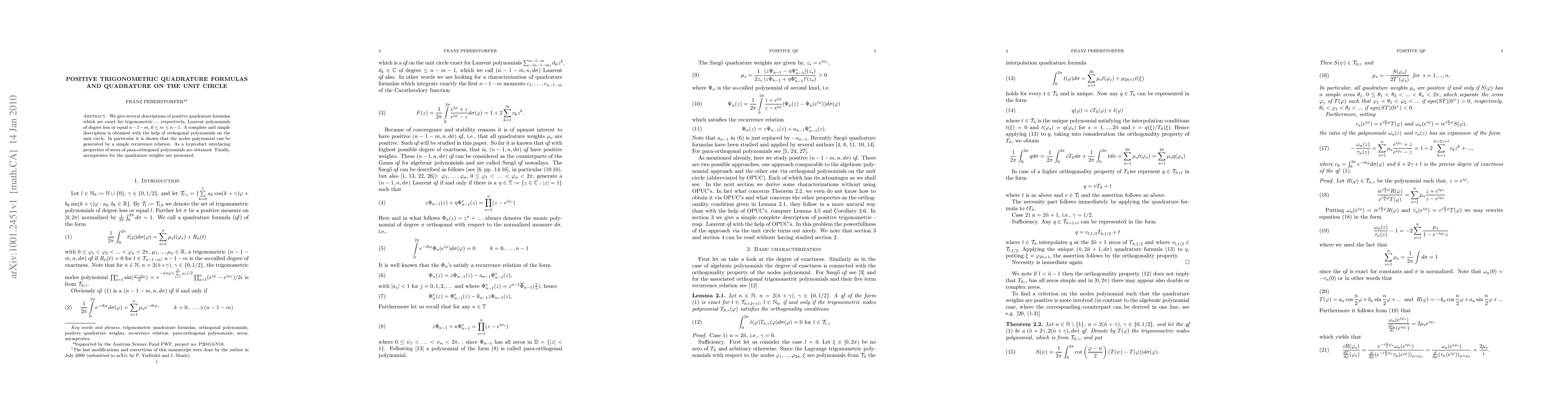 This paper presents positive quadrature formulas exact for trigonometric polynomials on the unit circle, utilizing orthogonal polynomials for a simple description. It also explores interlacing properties of zeros of para-orthogonal polynomials and provides asymptotics for the quadrature weights.