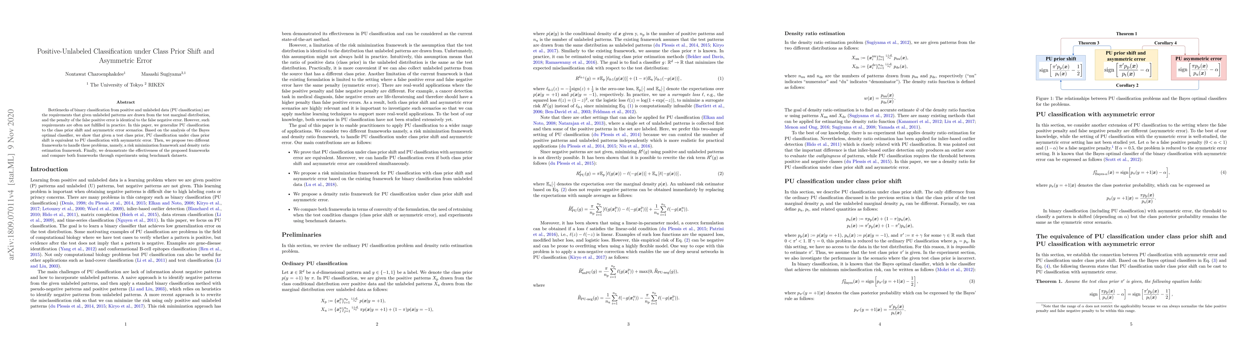 This paper generalizes positive-unlabeled (PU) classification to scenarios with class prior shift and asymmetric error. It proposes two frameworks—risk minimization and density ratio estimation—to address these challenges and demonstrates their effectiveness through experiments on benchmark datasets.