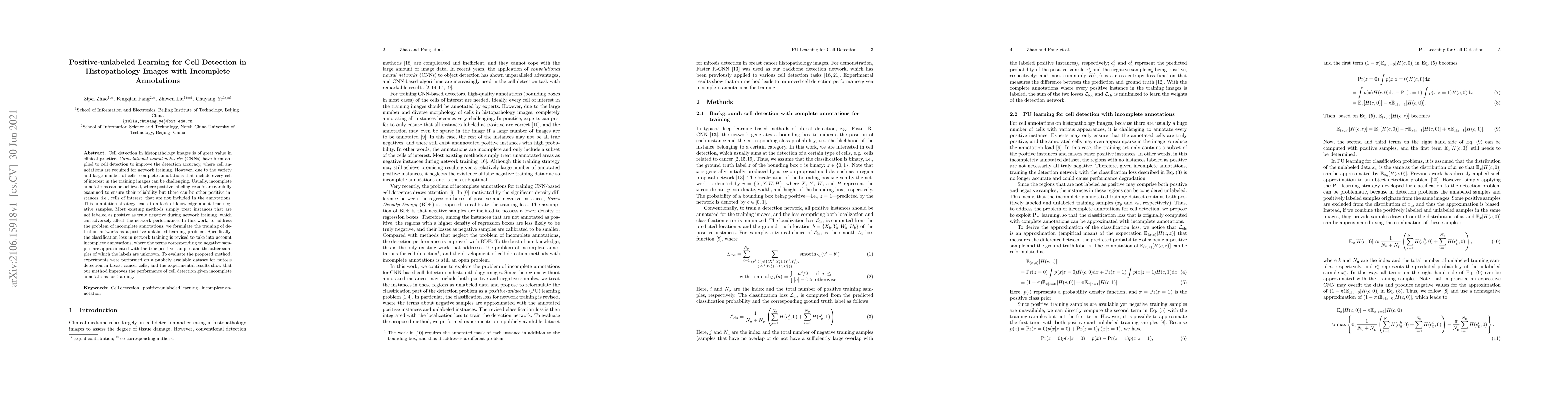 Cell detection in histopathology images is of great value in clinical practice. \textit{Convolutional neural networks} (CNNs) have been applied to cell detection to improve the detection accuracy, where cell annotations are required for network training. However, due to the variety and large number of cells, complete annotations that include every cell of interest in the training images can be challenging. Usually, incomplete annotations can be achieved, where positive labeling results are carefully examined to ensure their reliability but there can be other positive instances, i.e., cells of interest, that are not included in the annotations. This annotation strategy leads to a lack of knowledge about true negative samples. Most existing methods simply treat instances that are not labeled as positive as truly negative during network training, which can adversely affect the network performance. In this work, to address the problem of incomplete annotations, we formulate the training of detection networks as a positive-unlabeled learning problem. Specifically, the classification loss in network training is revised to take into account incomplete annotations, where the terms corresponding to negative samples are approximated with the true positive samples and the other samples of which the labels are unknown. To evaluate the proposed method, experiments were performed on a publicly available dataset for mitosis detection in breast cancer cells, and the experimental results show that our method improves the performance of cell detection given incomplete annotations for training.