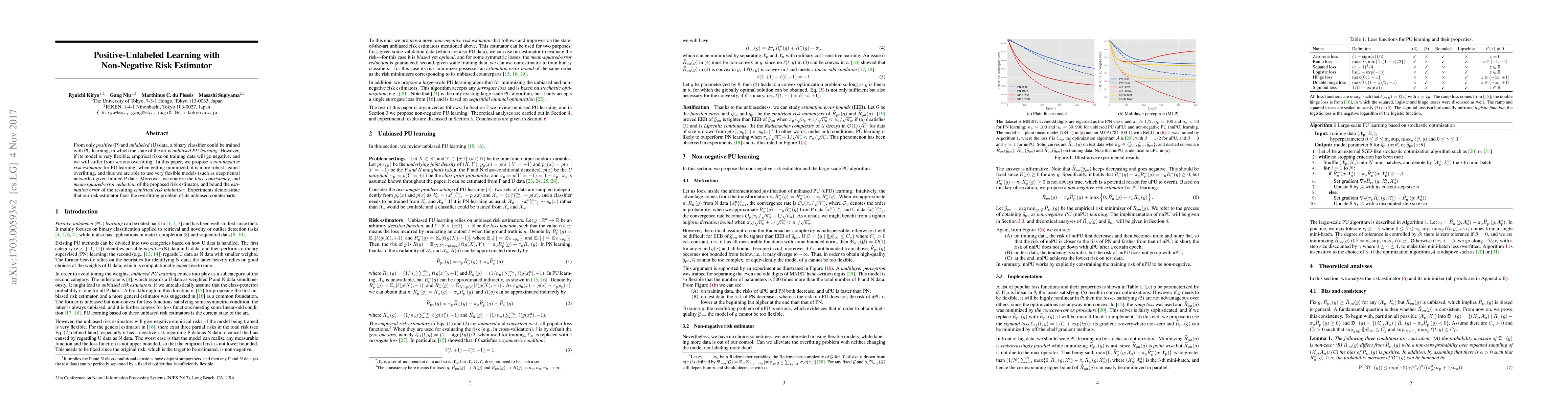 From only positive (P) and unlabeled (U) data, a binary classifier could be trained with PU learning, in which the state of the art is unbiased PU learning. However, if its model is very flexible, empirical risks on training data will go negative, and we will suffer from serious overfitting. In this paper, we propose a non-negative risk estimator for PU learning: when getting minimized, it is more robust against overfitting, and thus we are able to use very flexible models (such as deep neural networks) given limited P data. Moreover, we analyze the bias, consistency, and mean-squared-error reduction of the proposed risk estimator, and bound the estimation error of the resulting empirical risk minimizer. Experiments demonstrate that our risk estimator fixes the overfitting problem of its unbiased counterparts.