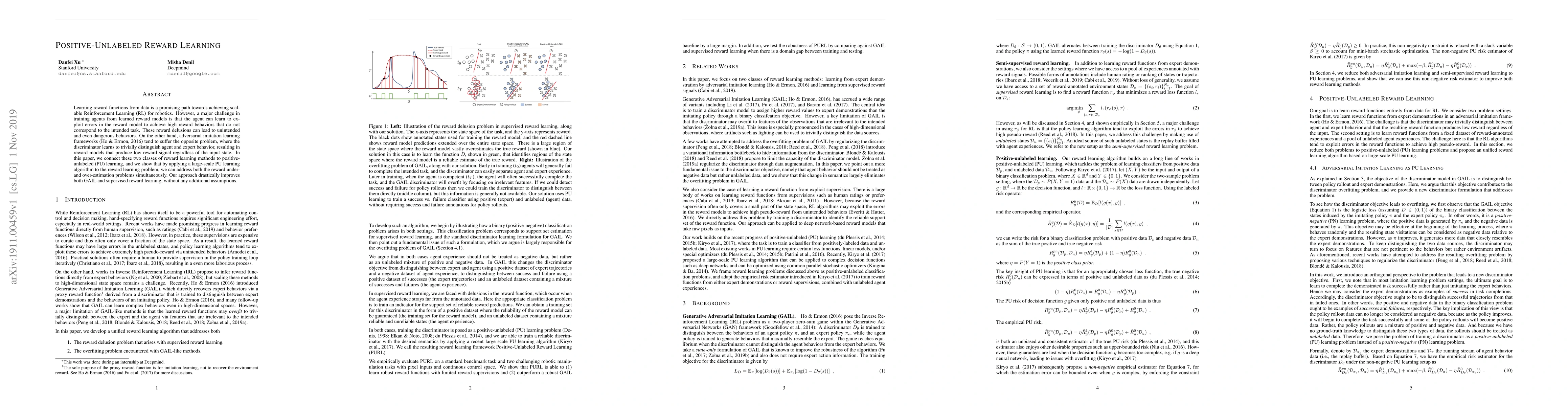Learning reward functions from data is a promising path towards achieving scalable Reinforcement Learning (RL) for robotics. However, a major challenge in training agents from learned reward models is that the agent can learn to exploit errors in the reward model to achieve high reward behaviors that do not correspond to the intended task. These reward delusions can lead to unintended and even dangerous behaviors. On the other hand, adversarial imitation learning frameworks tend to suffer the opposite problem, where the discriminator learns to trivially distinguish agent and expert behavior, resulting in reward models that produce low reward signal regardless of the input state. In this paper, we connect these two classes of reward learning methods to positive-unlabeled (PU) learning, and we show that by applying a large-scale PU learning algorithm to the reward learning problem, we can address both the reward under- and over-estimation problems simultaneously. Our approach drastically improves both GAIL and supervised reward learning, without any additional assumptions.