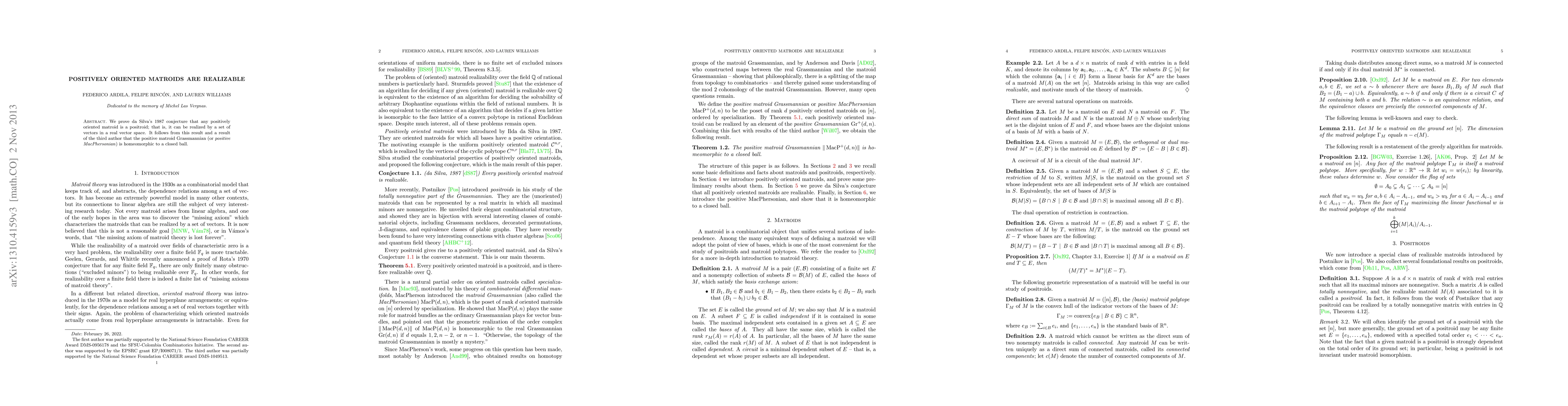 We prove da Silva's 1987 conjecture that any positively oriented matroid is a positroid; that is, it can be realized by a set of vectors in a real vector space. It follows from this result and a result of the third author that the positive matroid Grassmannian (or positive MacPhersonian) is homeomorphic to a closed ball.