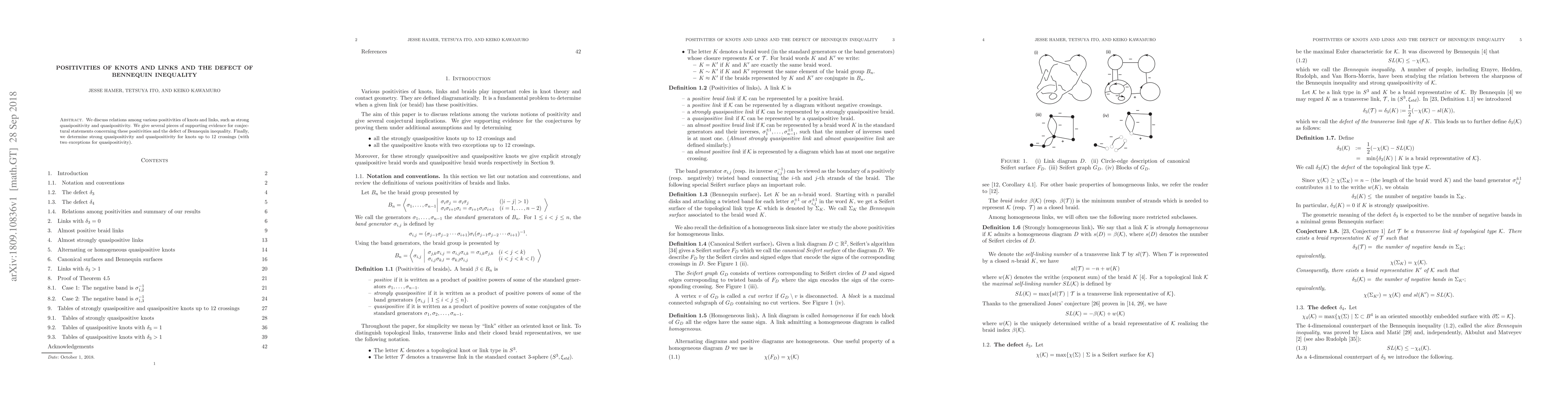 This paper explores the relationships between different types of knot and link positivities, including strong quasipositivity and quasipositivity, and provides evidence supporting conjectures about these concepts and the defect of the Bennequin inequality. It also determines the strong quasipositivity and quasipositivity for knots with up to 12 crossings, with minor exceptions.