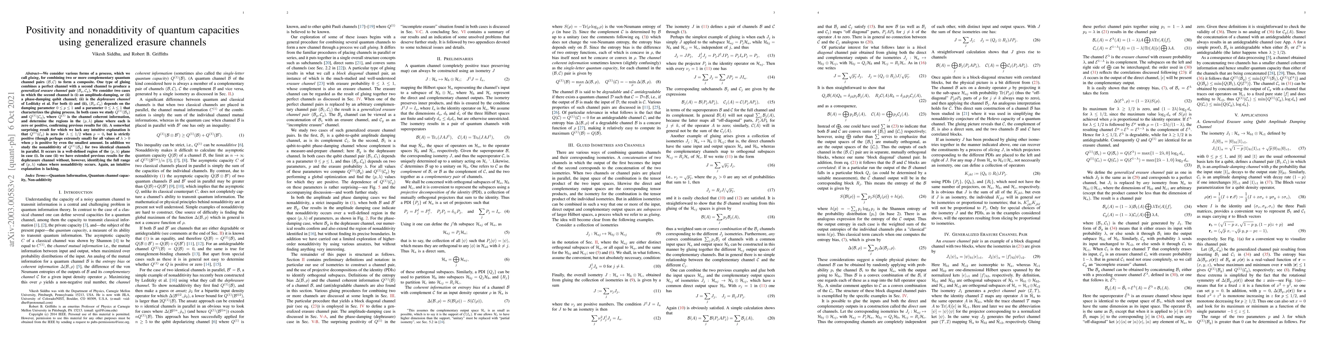 We consider various forms of a process, which we call {\em gluing}, for combining two or more complementary quantum channel pairs $(\mathcal{B},\mathcal{C})$ to form a composite. One type of gluing combines a perfect channel with a second channel to produce a \emph{generalized erasure channel} pair $(\mathcal{B}_g,\mathcal{C}_g)$. We consider two cases in which the second channel is (i) an amplitude-damping, or (ii) a phase-damping qubit channel; (ii) is the \emph{dephrasure channel} of Leditzky et al. For both (i) and (ii), $(\mathcal{B}_g,\mathcal{C}_g)$ depends on the damping parameter $0\leq p\leq 1$ and a parameter $0 \leq \lambda \leq 1$ that characterizes the gluing process. In both cases we study $Q^{(1)}(\mathcal{B}_g)$ and $Q^{(1)}(\mathcal{C}_g)$, where $Q^{(1)}$ is the channel coherent information, and determine the regions in the $(p,\lambda)$ plane where each is zero or positive, confirming previous results for (ii). A somewhat surprising result for which we lack any intuitive explanation is that $Q^{(1)}(\mathcal{C}_g)$ is zero for $\lambda \leq 1/2$ when $p=0$, but is strictly positive (though perhaps extremely small) for all values of $\lambda> 0$ when $p$ is positive by even the smallest amount. In addition we study the nonadditivity of $Q^{(1)}(\mathcal{B}_g)$ for two identical channels in parallel. It occurs in a well-defined region of the $(p,\lambda)$ plane in case (i). In case (ii) we have extended previous results for the dephrasure channel without, however, identifying the full range of $(p,\lambda)$ values where nonadditivity occurs. Again, an intuitive explanation is lacking.