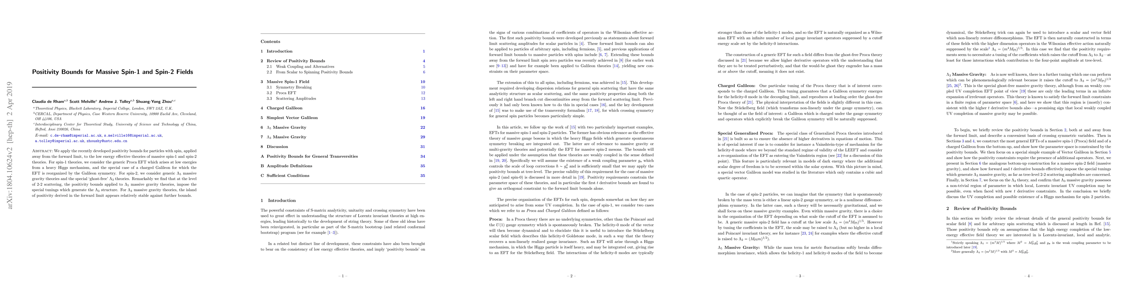 We apply the recently developed positivity bounds for particles with spin, applied away from the forward limit, to the low energy effective theories of massive spin-1 and spin-2 theories. For spin-1 theories, we consider the generic Proca EFT which arises at low energies from a heavy Higgs mechanism, and the special case of a charged Galileon for which the EFT is reorganized by the Galileon symmetry. For spin-2, we consider generic $\Lambda_5$ massive gravity theories and the special `ghost-free' $\Lambda_3$ theories. Remarkably we find that at the level of 2-2 scattering, the positivity bounds applied to $\Lambda_5$ massive gravity theories impose the special tunings which generate the $\Lambda_3$ structure. For $\Lambda_3$ massive gravity theories, the island of positivity derived in the forward limit appears relatively stable against further bounds.