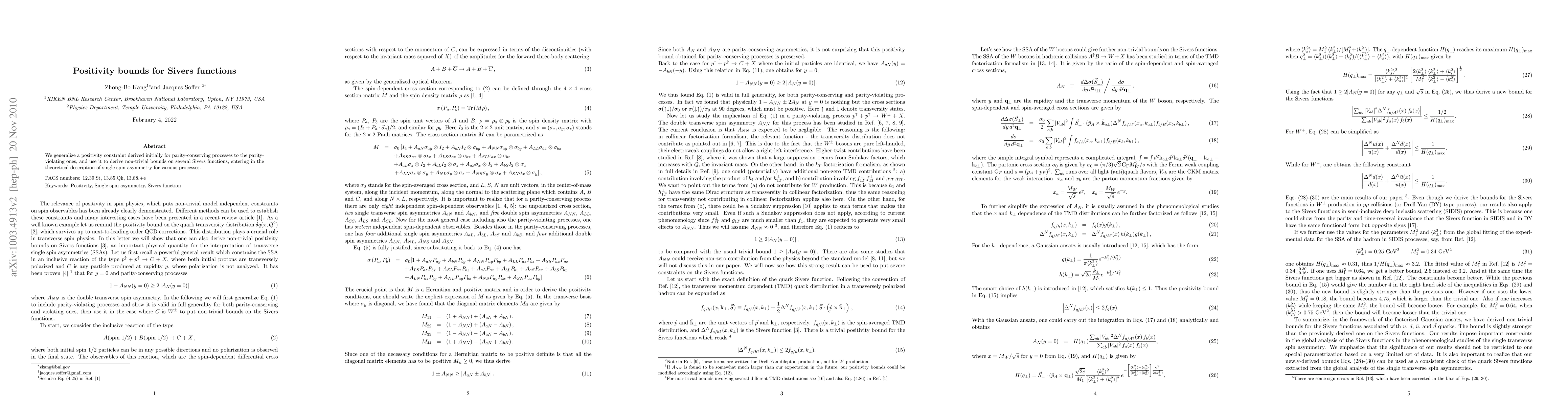 We generalize a positivity constraint derived initially for parity-conserving processes to the parity-violating ones, and use it to derive non-trivial bounds on several Sivers functions, entering in the theoretical description of single spin asymmetry for various processes.