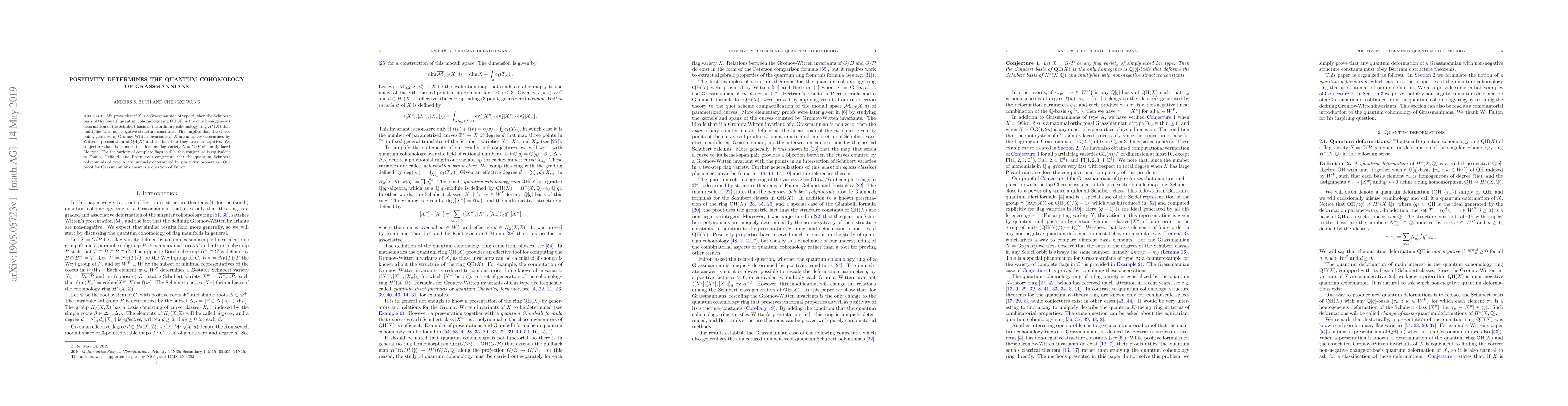 We prove that if X is a Grassmannian of type A, then the Schubert basis of the (small) quantum cohomology ring QH(X) is the only homogeneous deformation of the Schubert basis of the ordinary cohomology ring of X that multiplies with non-negative structure constants. This implies that the (three point, genus zero) Gromov-Witten invariants of X are uniquely determined by Witten's presentation of QH(X) and the fact that they are non-negative. We conjecture that the same is true for any flag variety X = G/P of simply laced Lie type. For the variety GL(n)/B of complete flags, this conjecture is equivalent to Fomin, Gelfand, and Postnikov's conjecture that the quantum Schubert polynomials of type A are uniquely determined by positivity properties. Our proof for Grassmannians answers a question of Fulton.