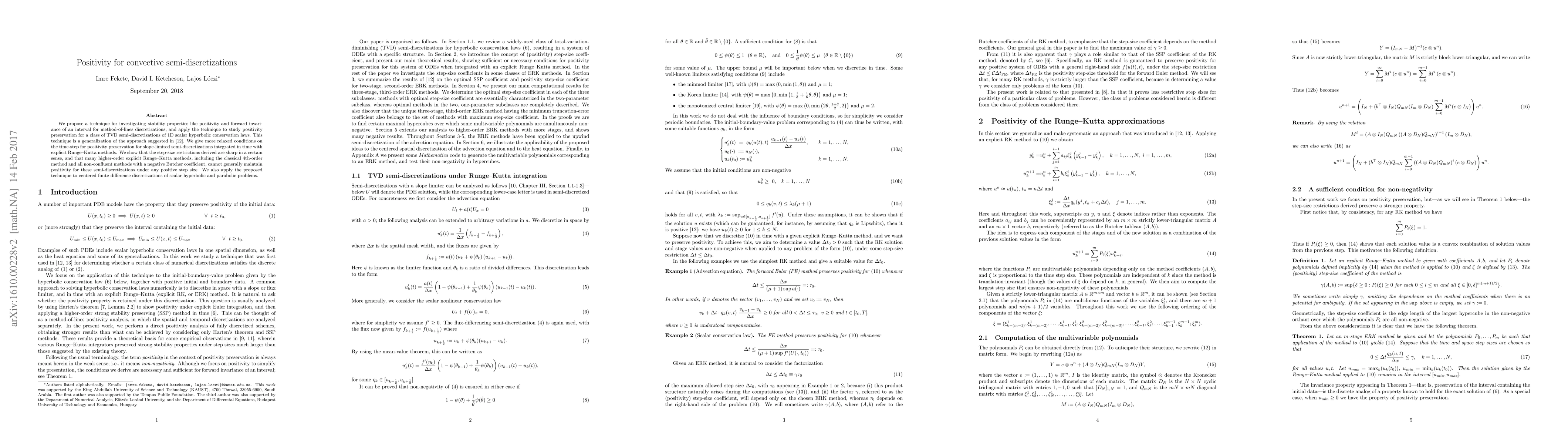 We propose a technique for investigating stability properties like positivity and forward invariance of an interval for method-of-lines discretizations, and apply the technique to study positivity preservation for a class of TVD semi-discretizations of 1D scalar hyperbolic conservation laws. This technique is a generalization of the approach suggested in ref. 12. We give more relaxed conditions on the time-step for positivity preservation for slope-limited semi-discretizations integrated in time with explicit Runge-Kutta methods. We show that the step-size restrictions derived are sharp in a certain sense, and that many higher-order explicit Runge-Kutta methods, including the classical 4th-order method and all non-confluent methods with a negative Butcher coefficient, cannot generally maintain positivity for these semi-discretizations under any positive step size. We also apply the proposed technique to centered finite difference discretizations of scalar hyperbolic and parabolic problems.