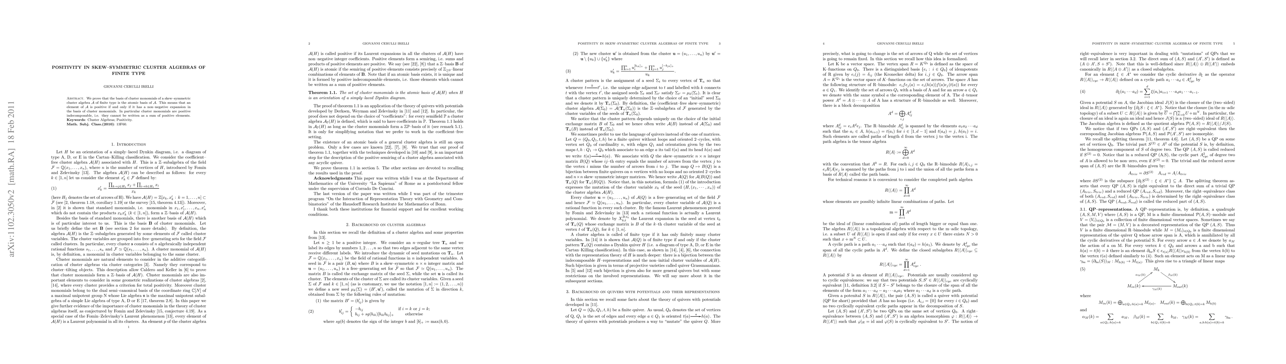 This paper proves that the cluster monomials form the atomic basis of skew-symmetric cluster algebras of finite type, ensuring positivity through non-negative expansions in this basis. Cluster monomials are shown to be positive and indecomposable, meaning they cannot be expressed as sums of other positive elements.