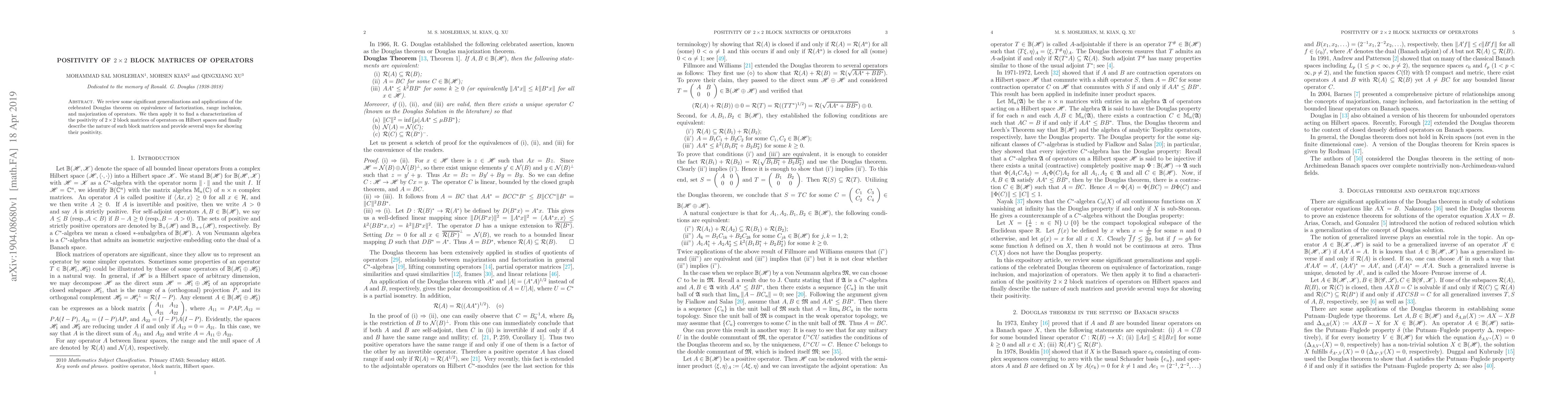 This paper reviews generalizations and applications of Douglas theorem, using it to characterize the positivity of $2\times 2$ block matrices of operators in Hilbert spaces, and provides methods to demonstrate their positivity.
