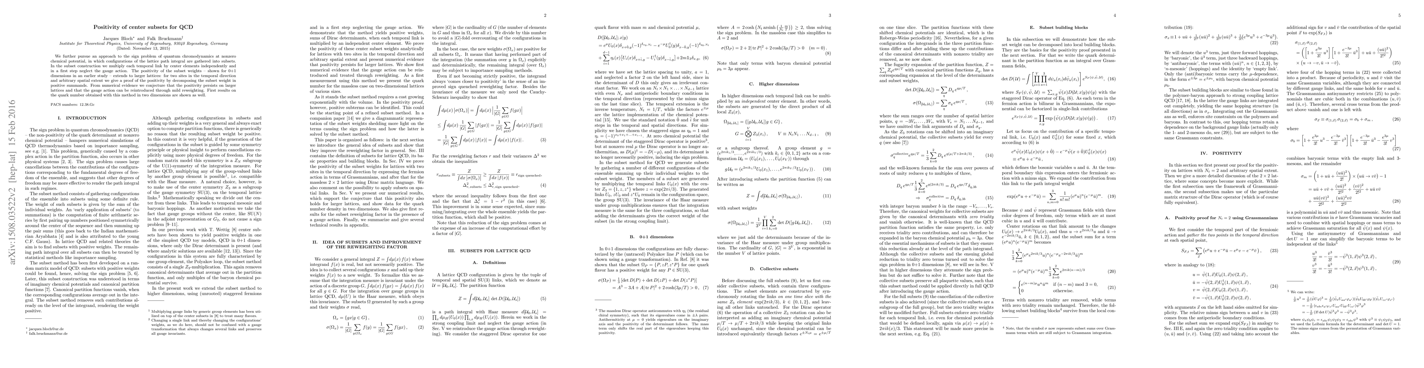 We further pursue an approach to the sign problem of quantum chromodynamics at nonzero chemical potential, in which configurations of the lattice path integral are gathered into subsets. In the subset construction we multiply each temporal link by center elements independently and in a first step neglect the gauge action. The positivity of the subset weights -- shown for 0+1 dimensions in an earlier study -- extends to larger lattices: for two sites in the temporal direction and arbitrary spatial extent we give a proof of the positivity by decomposing the subset weight in positive summands. From numerical evidence we conjecture that the positivity persists on larger lattices and that the gauge action can be reintroduced through mild reweighting. First results on the quark number obtained with this method in two dimensions are shown as well.