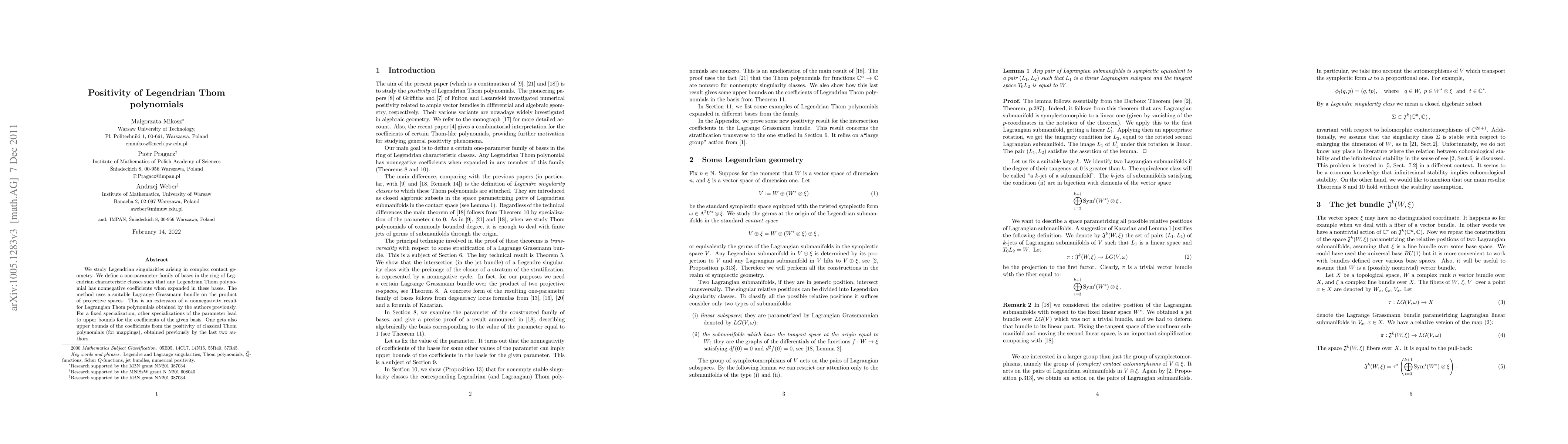 This paper explores Legendrian singularities in complex contact geometry, defining a one-parameter family of bases ensuring all Legendrian Thom polynomials have nonnegative coefficients. It extends previous nonnegativity results for Lagrangian Thom polynomials and provides upper bounds for coefficients through Lagrange Grassmann bundles and classical Thom polynomials.
