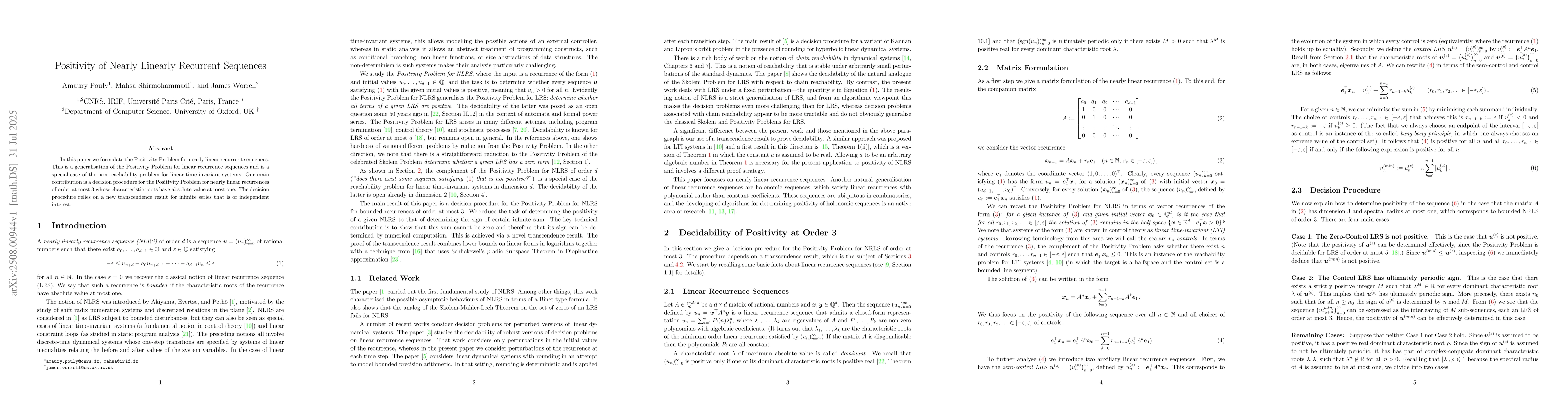 In this paper we formulate the Positivity Problem for nearly linear recurrent sequences. This is a generalisation of the Positivity Problem for linear recurrence sequences and is a special case of the non-reachability problem for linear time-invariant systems. Our main contribution is a decision procedure for the Positivity Problem for nearly linear recurrences of order at most 3 whose characteristic roots have absolute value at most one. The decision procedure relies on a new transcendence result for infinite series that is of independent interest.