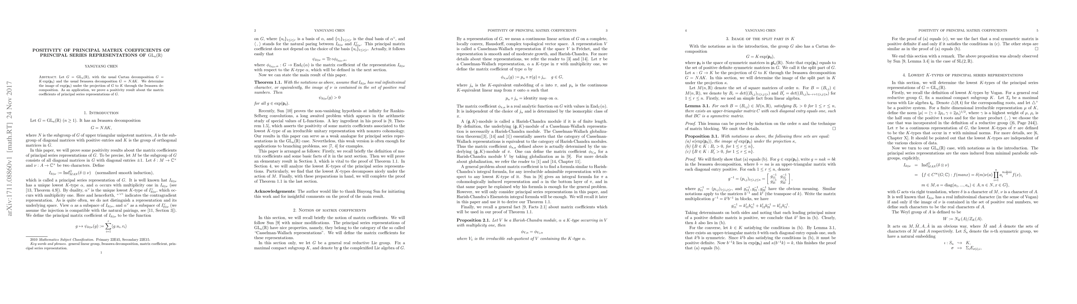 This research paper studies the principal series representations of $GL_{n}(R)$, focusing on the positivity of principal matrix coefficients, and determines its image under Iwasawa decomposition.