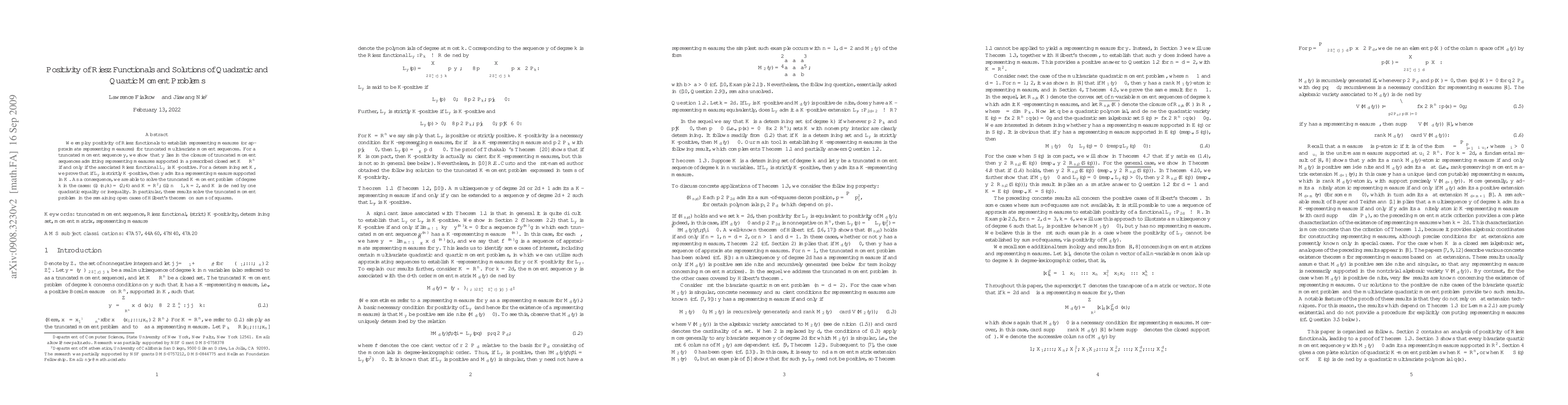 We employ positivity of Riesz functionals to establish representing measures (or approximate representing measures) for truncated multivariate moment sequences. For a truncated moment sequence $y$, we show that $y$ lies in the closure of truncated moment sequences admitting representing measures supported in a prescribed closed set $K \subseteq \re^n$ if and only if the associated Riesz functional $L_y$ is $K$-positive. For a determining set $K$, we prove that if $L_y$ is strictly $K$-positive, then $y$ admits a representing measure supported in $K$. As a consequence, we are able to solve the truncated $K$-moment problem of degree $k$ in the cases: (i) $(n,k)=(2,4)$ and $K=\re^2$; (ii) $n\geq 1$, $k=2$, and $K$ is defined by one quadratic equality or inequality. In particular, these results solve the truncated moment problem in the remaining open cases of Hilbert's theorem on sums of squares.