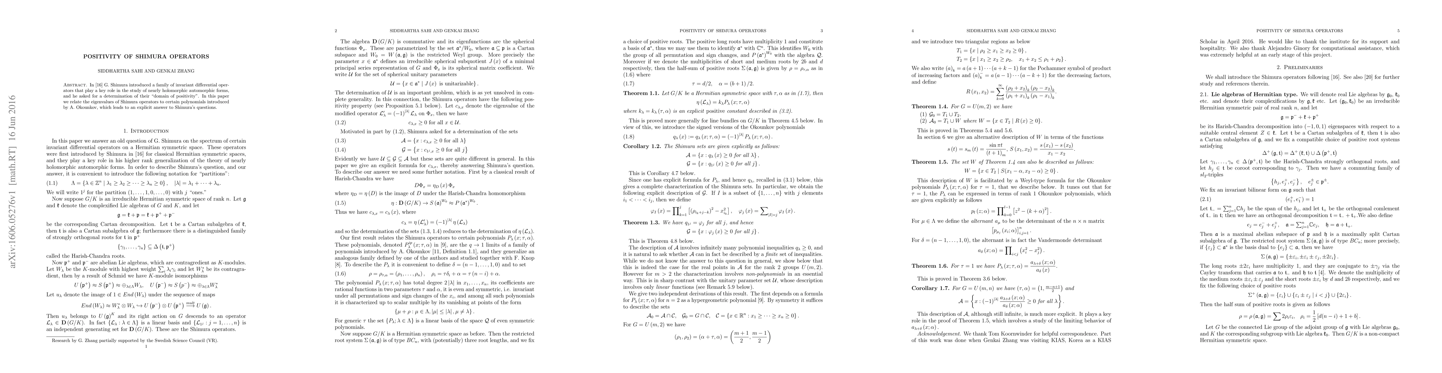 In [16] G. Shimura introduced a family of invariant differential operators that play a key role in the study of nearly holomorphic automorphic forms, and he asked for a determination of their \textquotedblleft domain of positivity\textquotedblright. In this paper we relate the eigenvalues of Shimura operators to certain polynomials introduced by A. Okounkov, which leads to an explicit answer to Shimura's questions.