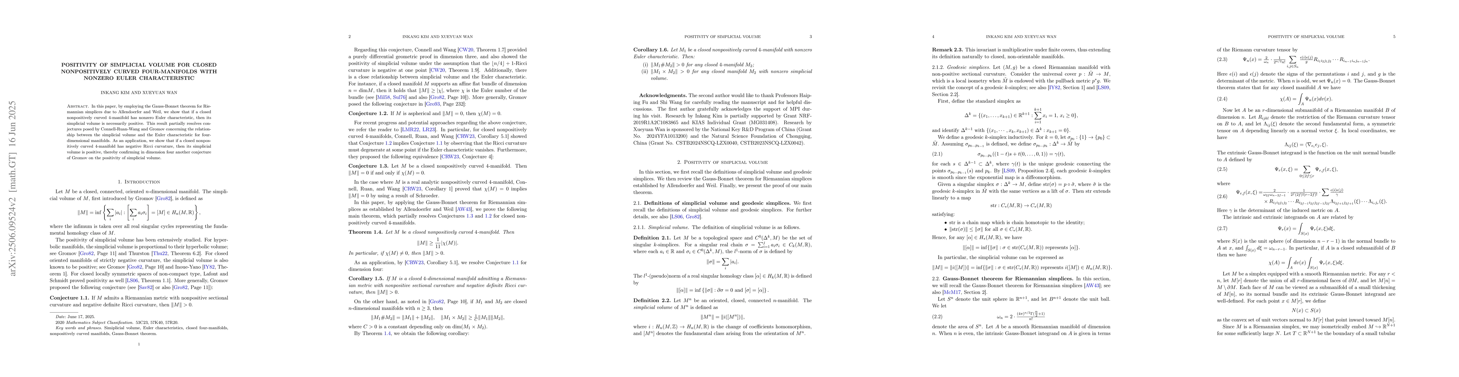 This research proves that certain four-dimensional shapes with nonpositive curvature and nonzero Euler characteristic must have a positive measure called simplicial volume. It also supports conjectures linking curvature, topology, and this volume, especially in cases of negative Ricci curvature.
