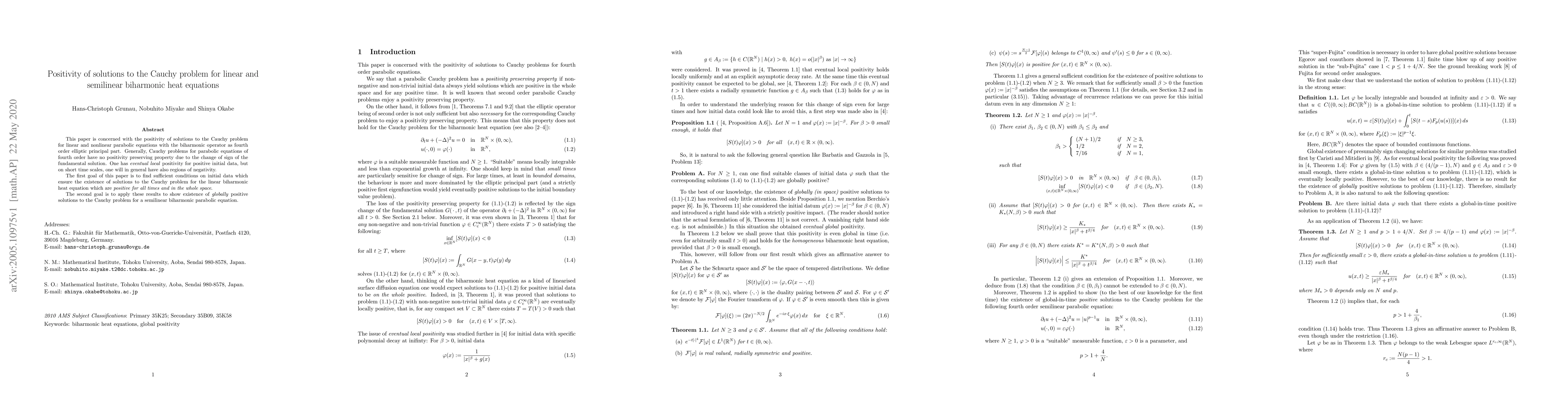 This paper is concerned with the positivity of solutions to the Cauchy problem for linear and nonlinear parabolic equations with the biharmonic operator as fourth order elliptic principal part. Generally, Cauchy problems for parabolic equations of fourth order have no positivity preserving property due to the change of sign of the fundamental solution. One has eventual local positivity for positive initial data, but on short time scales, one will in general have also regions of negativity. The first goal of this paper is to find sufficient conditions on initial data which ensure the existence of solutions to the Cauchy problem for the linear biharmonic heat equation which are positive for all times and in the whole space. The second goal is to apply these results to show existence of globally positive solutions to the Cauchy problem for a semilinear biharmonic parabolic equation.