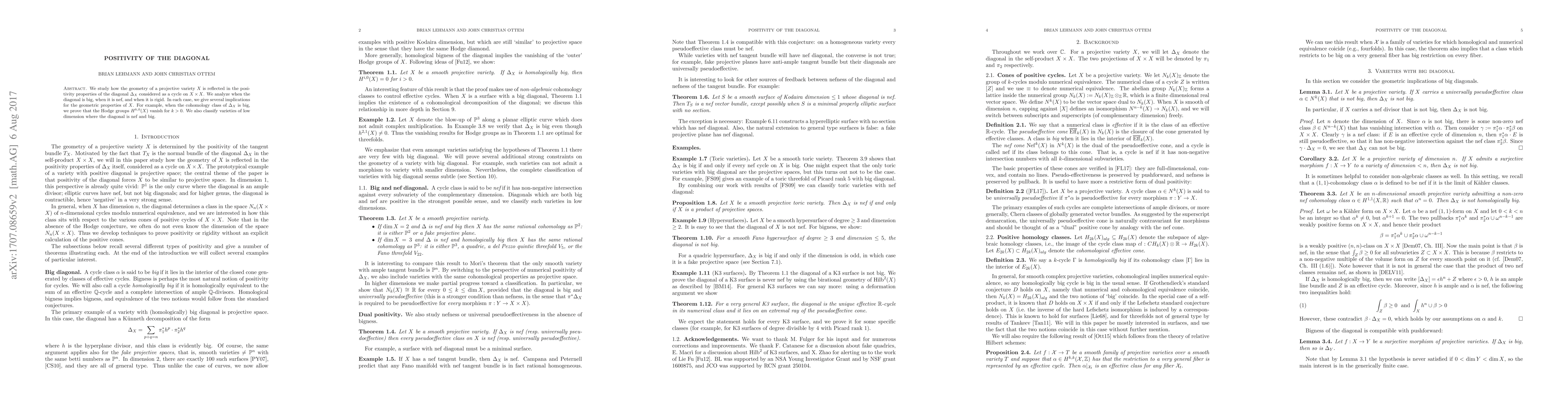 This paper investigates the geometric implications of the positivity properties of the diagonal $\Delta_X$ in projective varieties $X$, classifying when it is big, nef, or rigid, and proving that a big diagonal implies vanishing of Hodge groups $H^{k,0}(X)$ for $k>0$. It also classifies low-dimensional varieties where the diagonal is both nef and big.