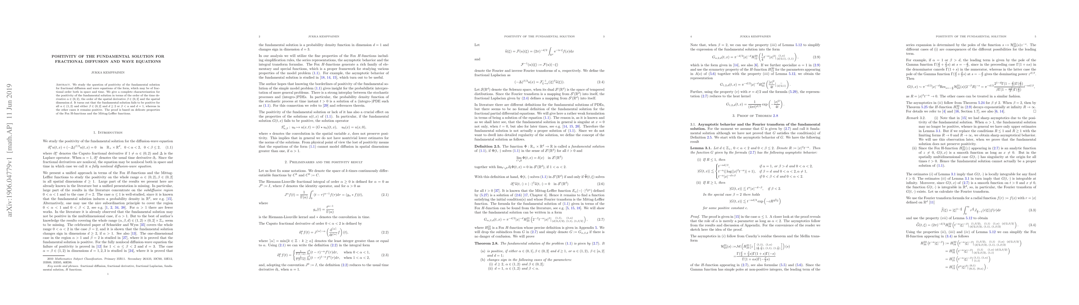 The fundamental solution for fractional diffusion and wave equations is either positive or negative depending on the order of derivatives and dimension, but fails to be positive in specific cases where the time derivative order is between 1 and 2.