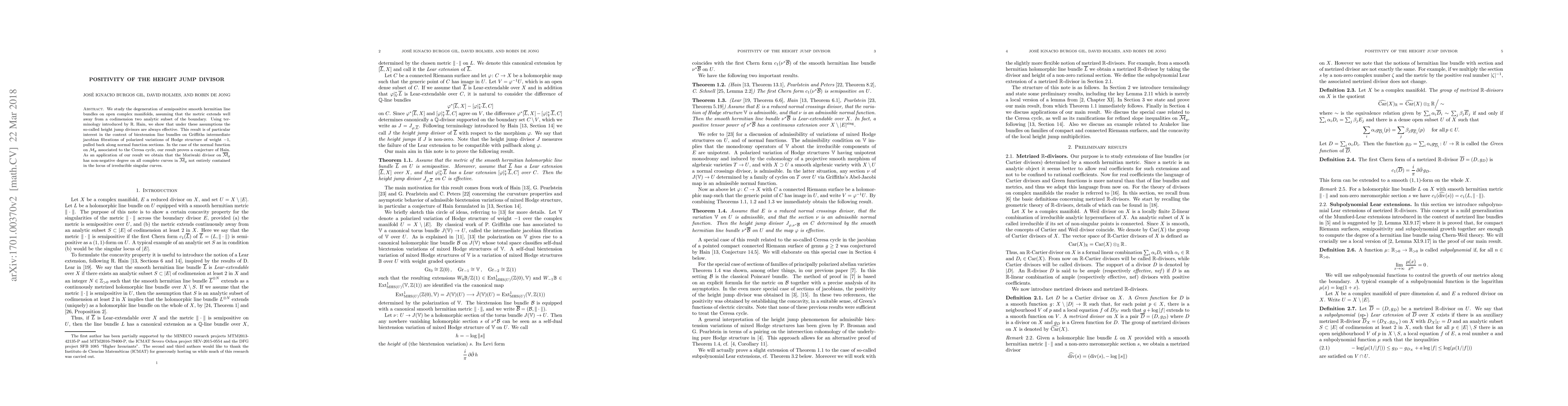 We study the degeneration of semipositive smooth hermitian line bundles on open complex manifolds, assuming that the metric extends well away from a codimension two analytic subset of the boundary. Using terminology introduced by R. Hain, we show that under these assumptions the so-called height jump divisors are always effective. This result is of particular interest in the context of biextension line bundles on Griffiths intermediate jacobian fibrations of polarized variations of Hodge structure of weight -1, pulled back along normal function sections. In the case of the normal function on M_g associated to the Ceresa cycle, our result proves a conjecture of Hain. As an application of our result we obtain that the Moriwaki divisor on \bar M_g has non-negative degree on all complete curves in \bar M_g not entirely contained in the locus of irreducible singular curves.