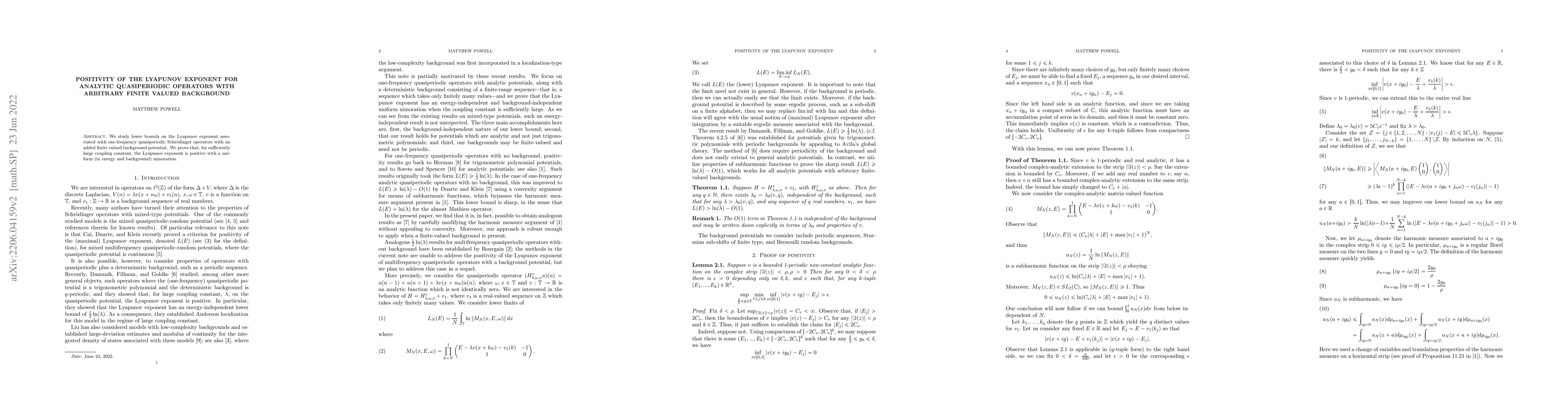 Summary: This paper establishes lower bounds for the Lyapunov exponent in quasiperiodic Schrödinger operators with finite background potentials, proving that the exponent is positive for sufficiently large coupling constants, with a uniform minoration across energy levels and backgrounds.