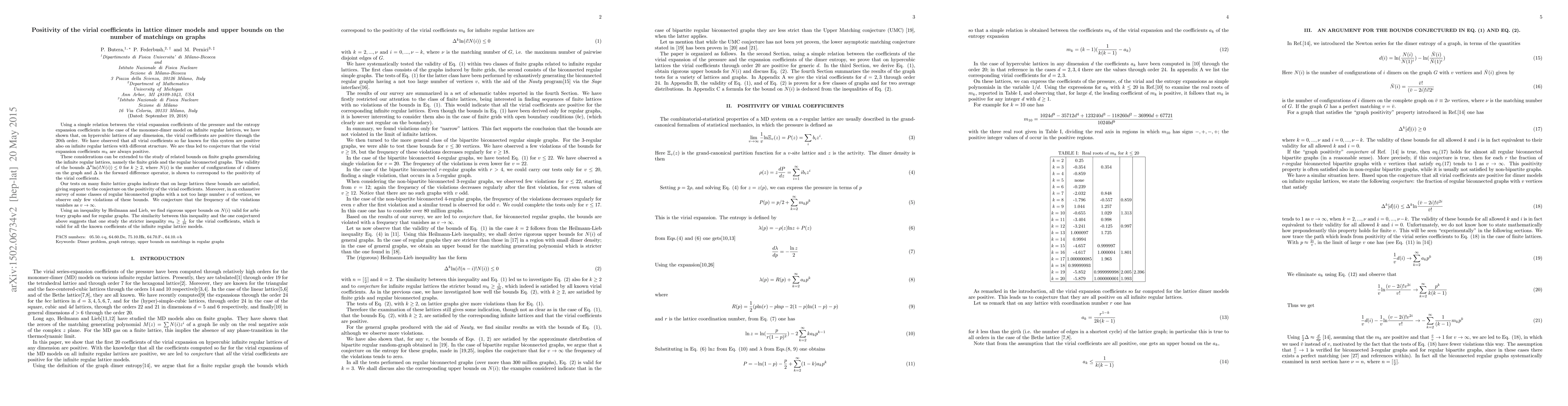 This paper demonstrates the positivity of virial coefficients in lattice dimer models through the 20th order and conjectures that they remain positive for all orders. It also establishes upper bounds on the number of matchings on finite graphs, showing that these bounds correspond to the positivity of the virial coefficients, and suggests that the frequency of violations diminishes as the number of vertices increases.