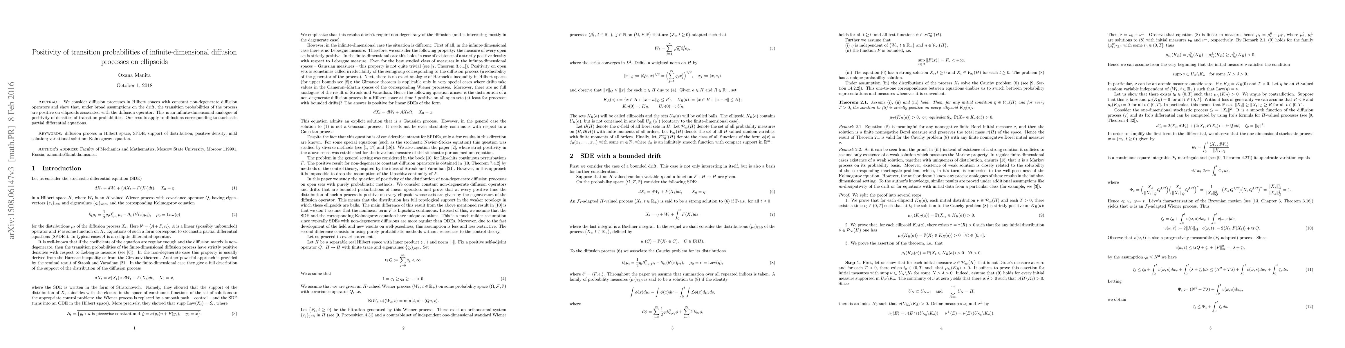 This paper proves the positivity of transition probabilities for infinite-dimensional diffusion processes in Hilbert spaces, specifically on ellipsoids, under general assumptions on the drift. The findings extend the concept of positive transition densities to stochastic partial differential equations.
