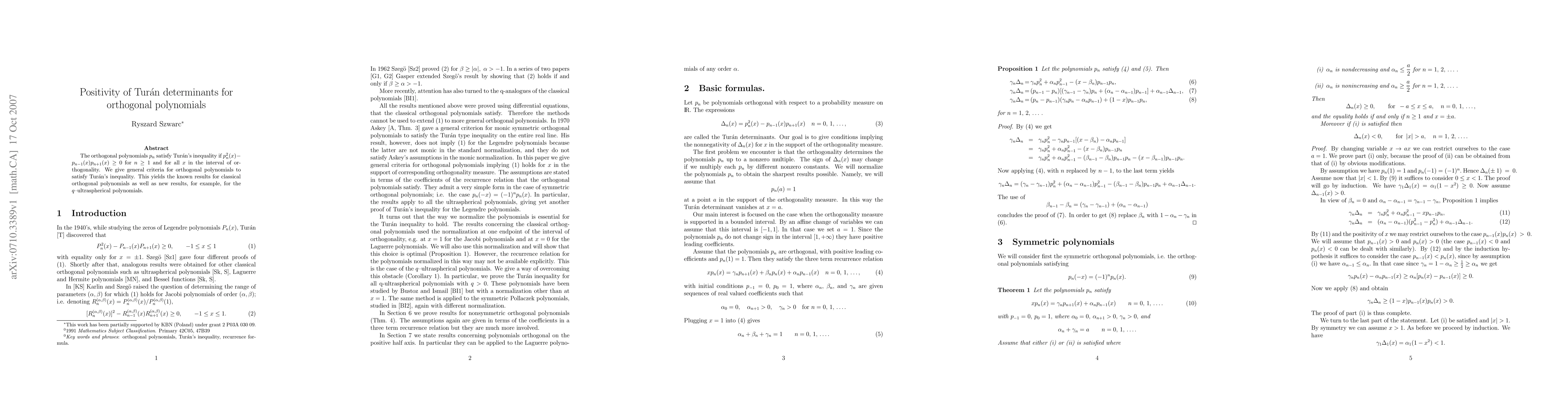The paper provides general criteria for orthogonal polynomials to satisfy Turan's inequality, a known result for classical polynomials and new results for q-ultraspherical polynomials.
