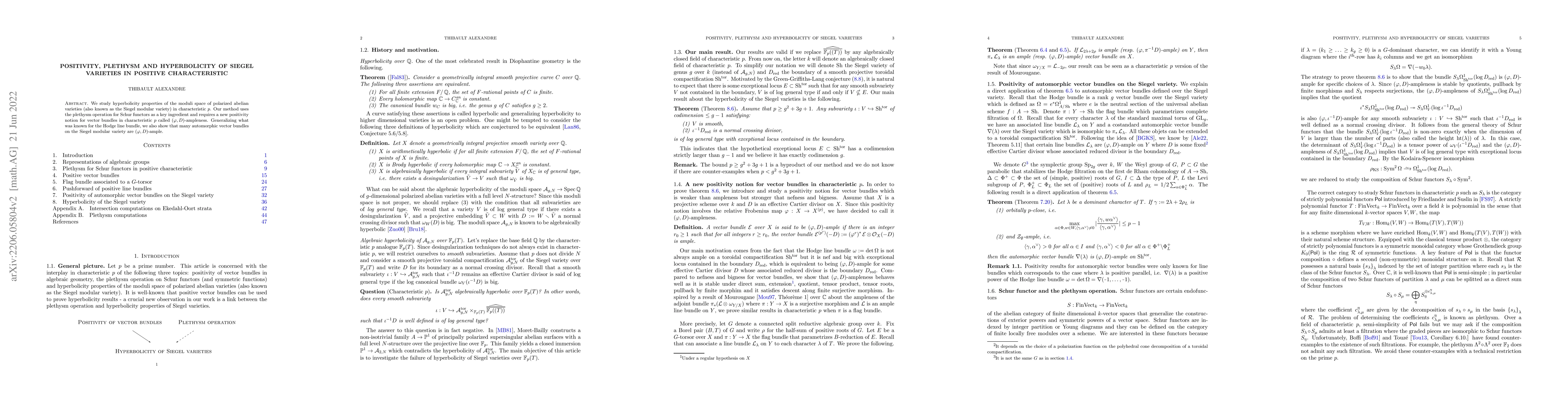 This paper explores hyperbolicity properties of Siegel modular varieties in positive characteristic, utilizing plethysm of Schur functors and introduces a new notion of $(\varphi,D)$-ampleness for vector bundles, proving ampleness for many automorphic bundles on these varieties.